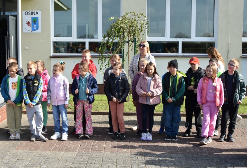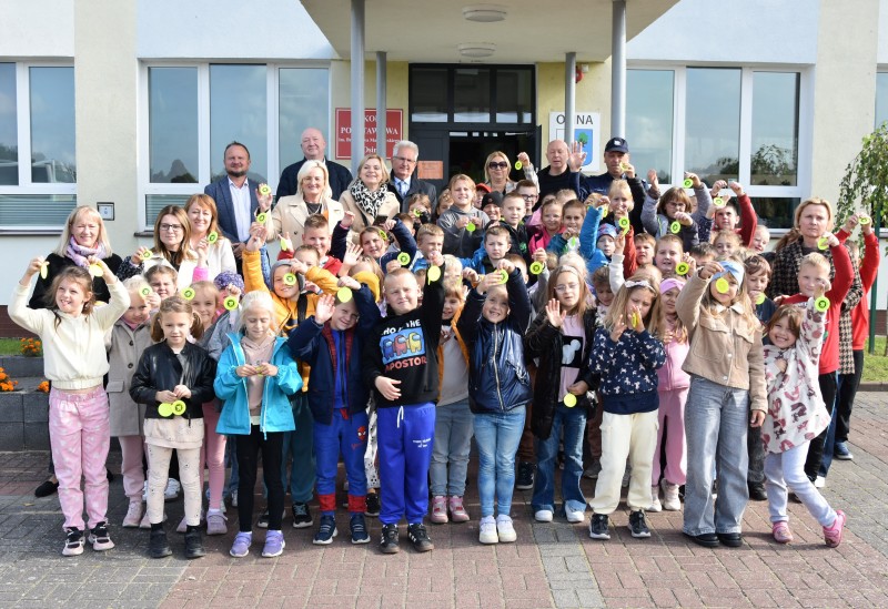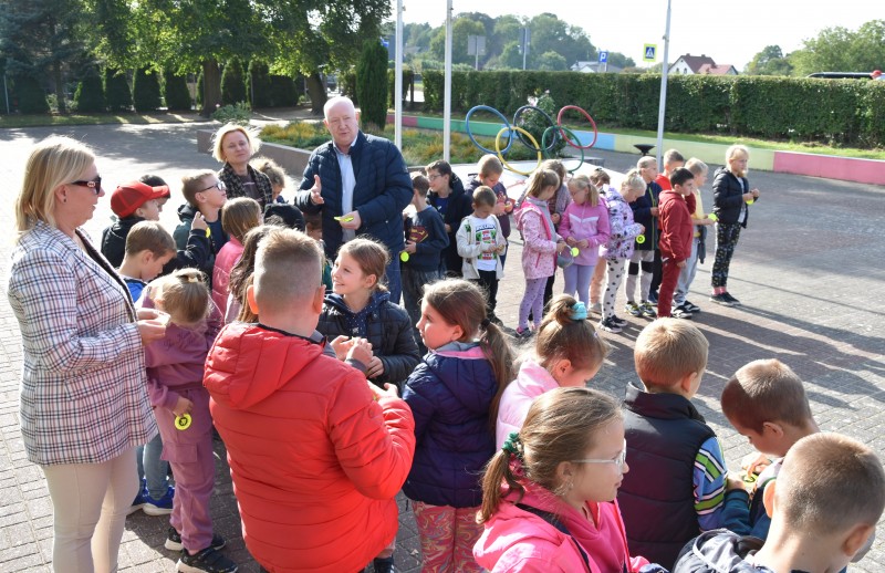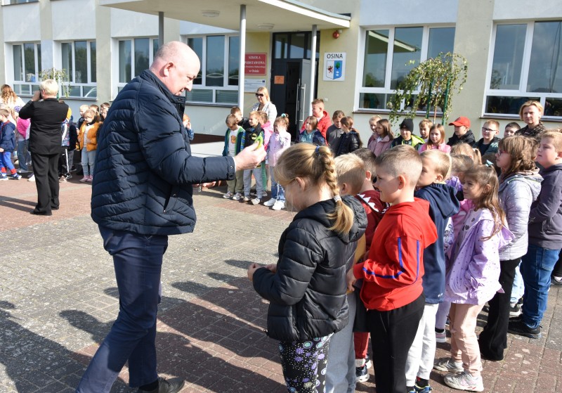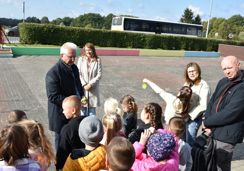 Starosta Goleniowski Tomasz Stanisławski wspólnie z Wójtem Osiny Krzysztofem Szwedo rozdawali odblaski uczniom Szkoły Podstawowej im. Bronisława Malinowskiego w Osinie.