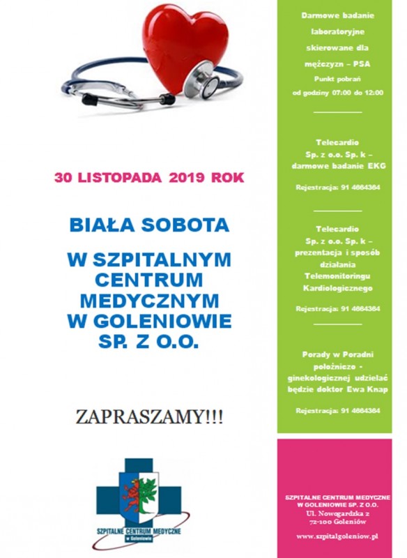 30 listopada 2019 r. w Szpitalnym Centrum Medycznym w Goleniowie sp. z o.o. odbędzie się Biała Sobota. W tym dniu będą wykonywane bezpłatne badania oraz konsultacje specjalistyczne.