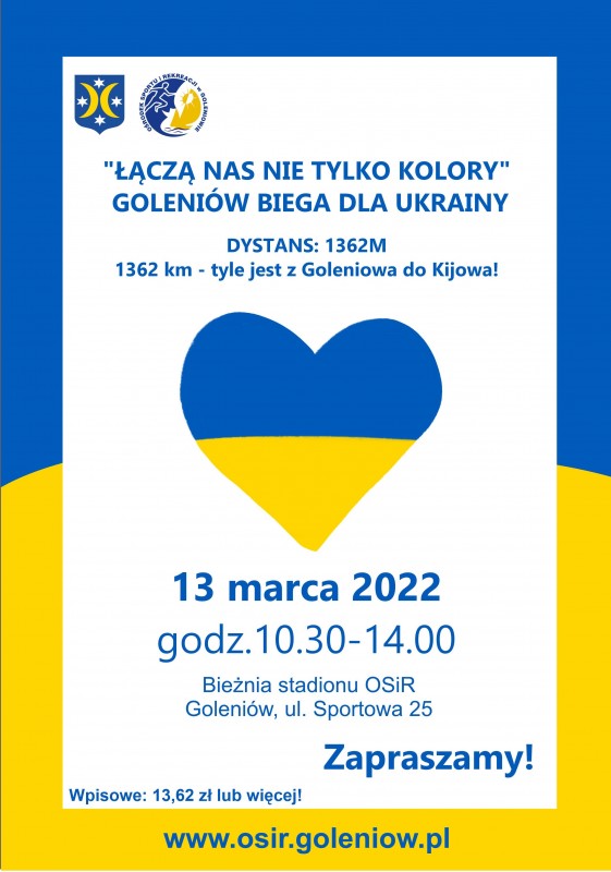 Dlaczego taki dystans? Ponieważ z Goleniowa do walczącej stolicy Ukrainy – Kijowa jest 1362 km. Bieg lub marsz dla mniej wprawionych przeprowadzimy na bieżni stadionu miejskiego OSiR w Goleniowie na ul. Sportowej 25. Zapraszamy wszystkich - dzieci, młodzież, dorosłych, którzy chcą pomóc przebywającym na terenie Goleniowa Ukraińcom.