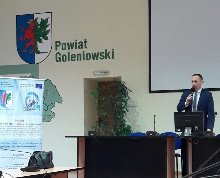 W dniu 22 lutego 2017 roku Starosta Goleniowski Tomasz Kulinicz gościł w budynku Starostwa Powiatowego w Goleniowie drugą grupę stażystów z Zespołu Szkół Ponadgimnazjalnych w Nowogardzie wraz z koordynatorem projektu Panią Jowitą Pawlak.