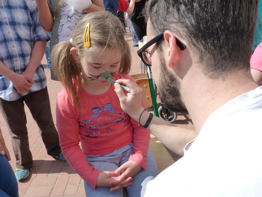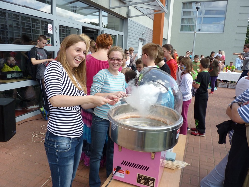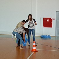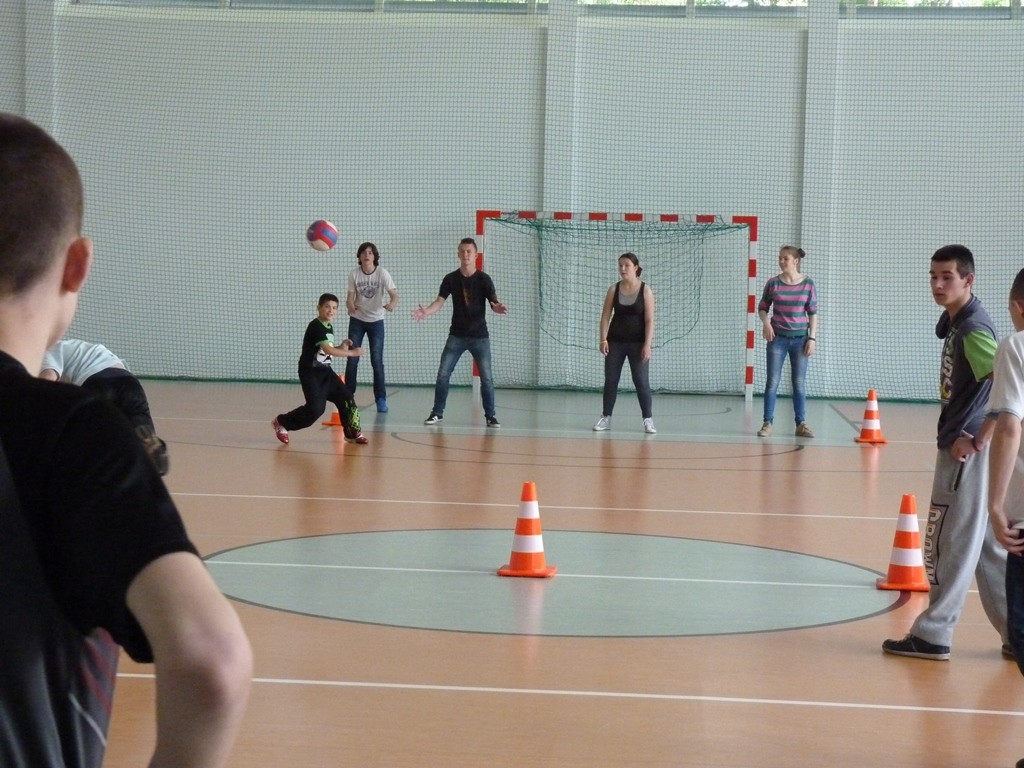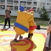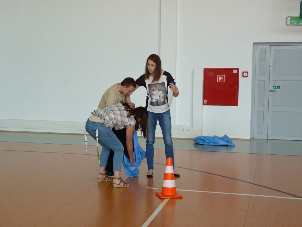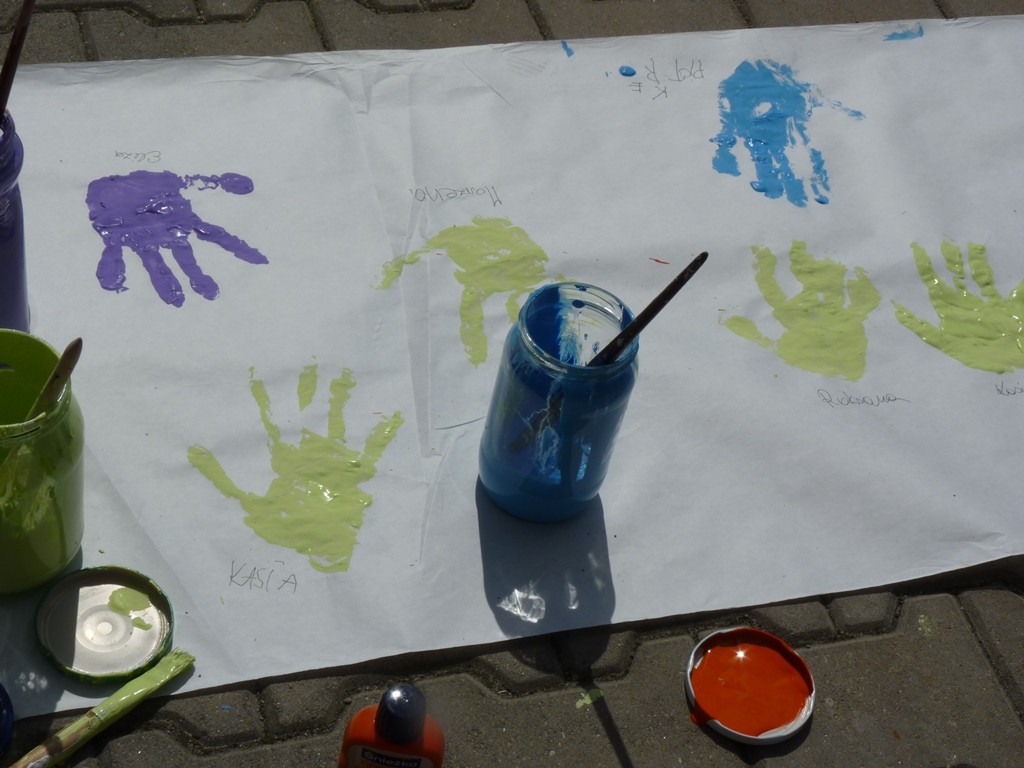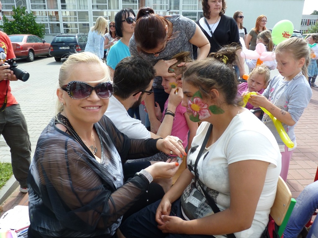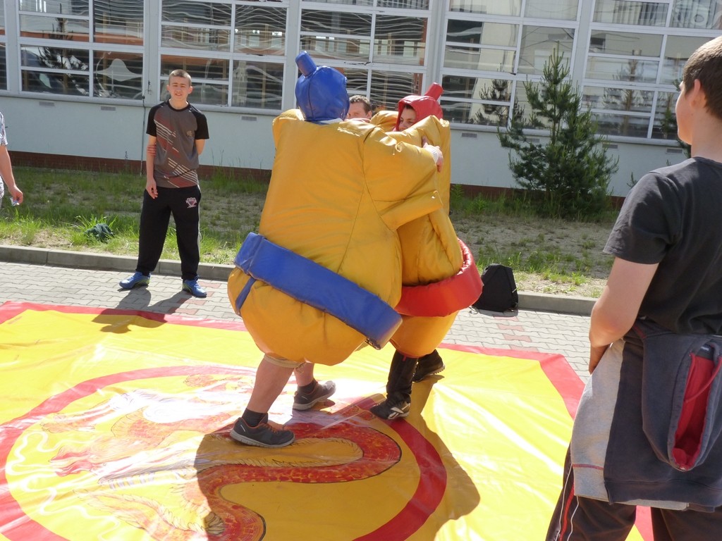 Trzeba przyznać, że się działo…ruszaliśmy śmiało ciało: skoki w workach, biegi na nartach, zawody w przelewaniu wody, puzzle gigant, wszyscy ćwiczyli jak super roboty, zawody wycisnęły z Nich siódme poty. Kto na fizyczny wysiłek nie miał ochoty temu w głowie nie były głupoty: wytężał umysł i ćwiczył palce, malował i zgadywał, w jakiej to bajce, były widziane postacie bajkowe ukryte sprytnie w zabawie quizowej. Któremu uczniowi sił dużo zostało, jeszcze sumo na Niego czekało. Sumo z OSiR – u za darmo wypożyczone, w ręce uczniów powierzone. Zaoszczędzone w ten sposób pieniądze, mogliśmy przeznaczyć na smakołyki pachnące: kiełbaski, słodycze i watę cukrową wszystko popite było wodą zdrową. Na pożegnanie wspólne w kółeczku balowanie i zumby tańcowanie. Dzień był męczący, ale wesoły. Może uczniowie jeszcze chętniej będą przychodzić do naszej szkoły.