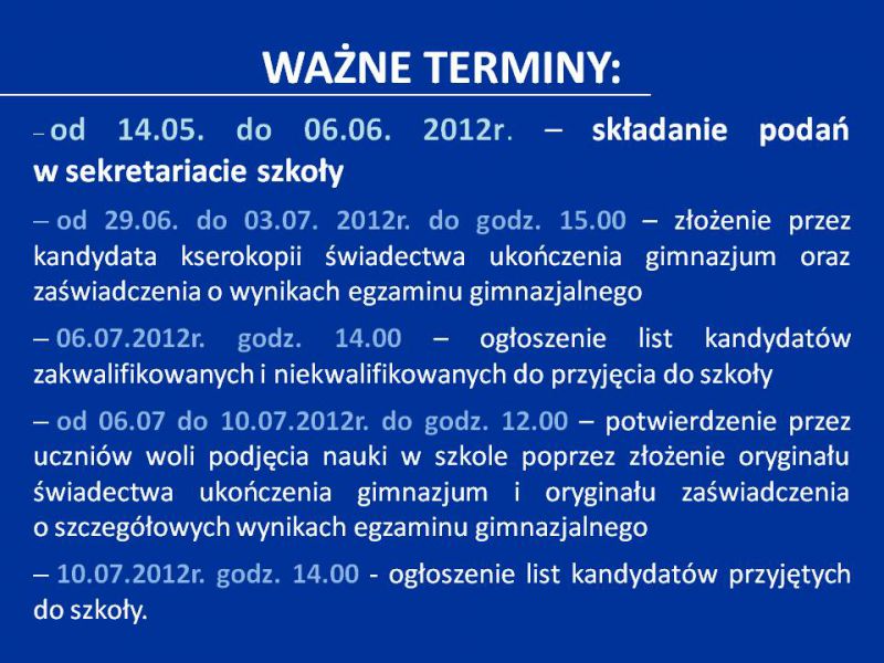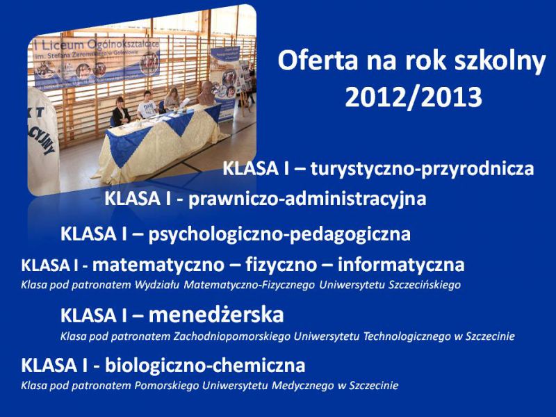 Ponadto gimnazjaliści mieli możliwość zapoznania się z ofertą edukacyjną przygotowaną przez liceum na rok szkolny 2012/2013 oraz zaznajomić się z sylwetką i osiągnięciami literackimi patrona szkoły –Stefana Żeromskiego.