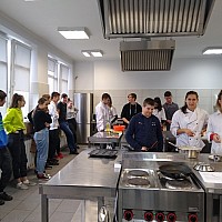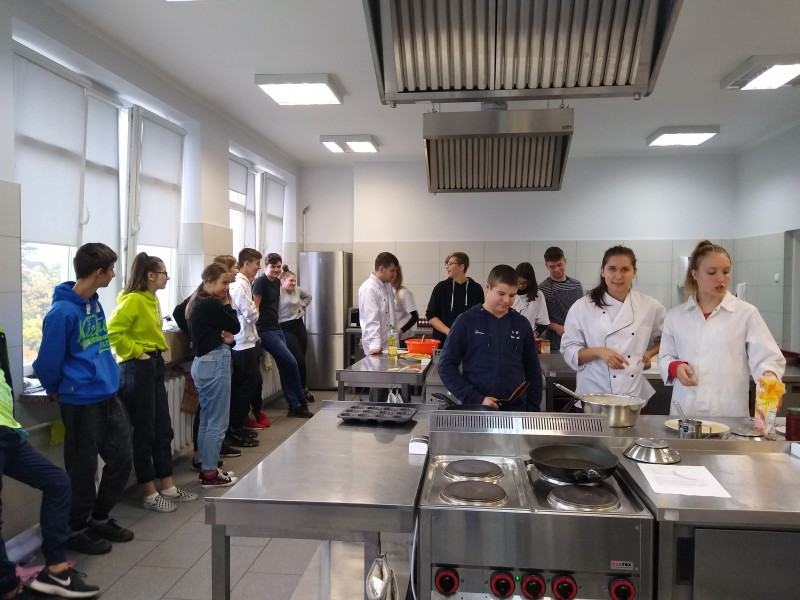 16 października odbyły się również warsztaty kulinarne. Uczniowie naszej szkoły uczyli młodszych kolegów jak w praktyce wykorzystuje się takie procesy technologiczne jak smażenie i pieczenie. Goście bardzo chętnie pomagali starszym kolegom w pieczeniu babeczek i smażeniu pysznych naleśników z dżemem. Po skończonej pracy wszyscy z apetytem zajadali smakołyki.