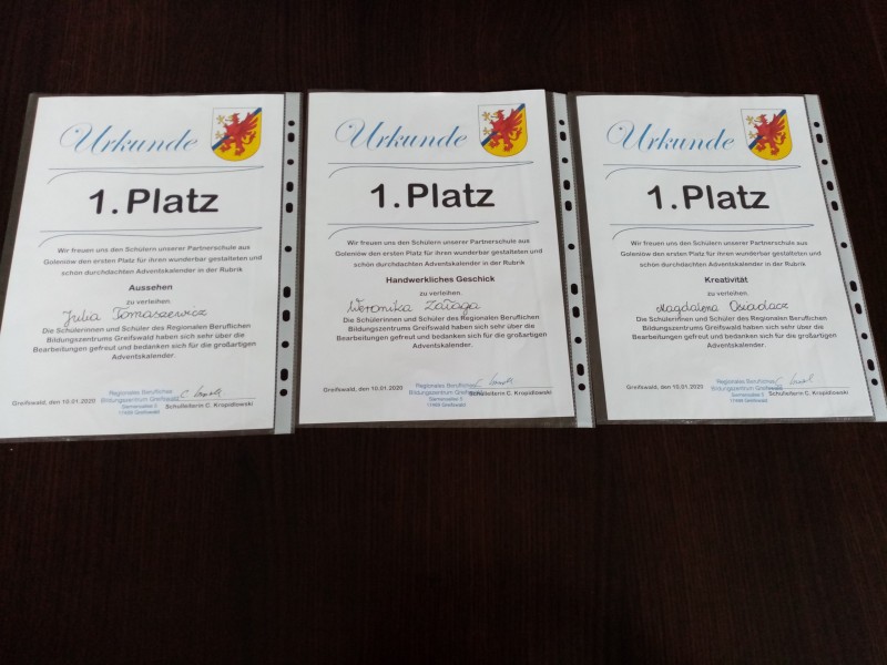 W grudniu 2019 r. uczeniowie naszej szkoły wzieli udział w I Międzyszkolnym Konkursie "DER SCHÖNSTE ADVENTSKALENDER” organizowanym przez szkołę Regionales Berufliches Bildungszentrum w Greiswaldzie. Celem konkursu było między innymi zainteresowanie uczniów kulturą, tradycją i obyczajami krajów niemieckiego obszaru językowego, popularyzacją języka niemieckiego, budzenie szacunku dla odmiennych kultur i tradycji innych narodów oraz pobudzanie uczniów do kreatywności i twórczej działalności. Zadanie konkursowe polegało na samodzielnym wykonaniu kalendarza adwentowego w dowolnej formie plastycznej, dowolną techniką (papier, karton, masa solna, glina, styropian, drewno, itd.).Cechą charakterystyczną tych kalendarzy miały być 24 okienka, w których powinny znajdować się dowolne zwroty, bądź słowa w języku niemieckim, związane ze świętami Bożego Narodzenia. Uczniowie Zespołu Szkół nr 1 w Goleniowie otrzymali wyróżnienia;