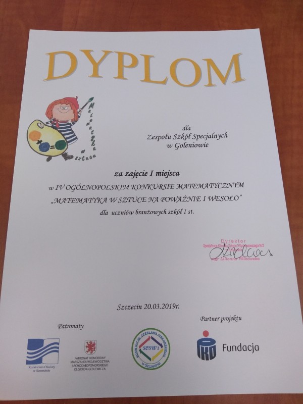 W dniu 20 marca 2019 r uczniowie Szkoły Branżowej Zespołu Szkół Specjalnych w Goleniowie Rafał Lieder i Dawid Błaszczyk pod opieką pani Renata Bojdy brali udział w IV Ogólnopolskim Konkursie Matematycznym (IX Wojewódzkim Konkursie Matematycznym) „Matematyka w sztuce na poważnie i wesoło” organizowanym przez SOSW nr 2 w Szczecinie pod patronatem honorowym Zachodniopomorskiego Kuratora Oświaty i Marszałka Województwa Zachodniopomorskiego. Konkurs składał się z trzech etapów.