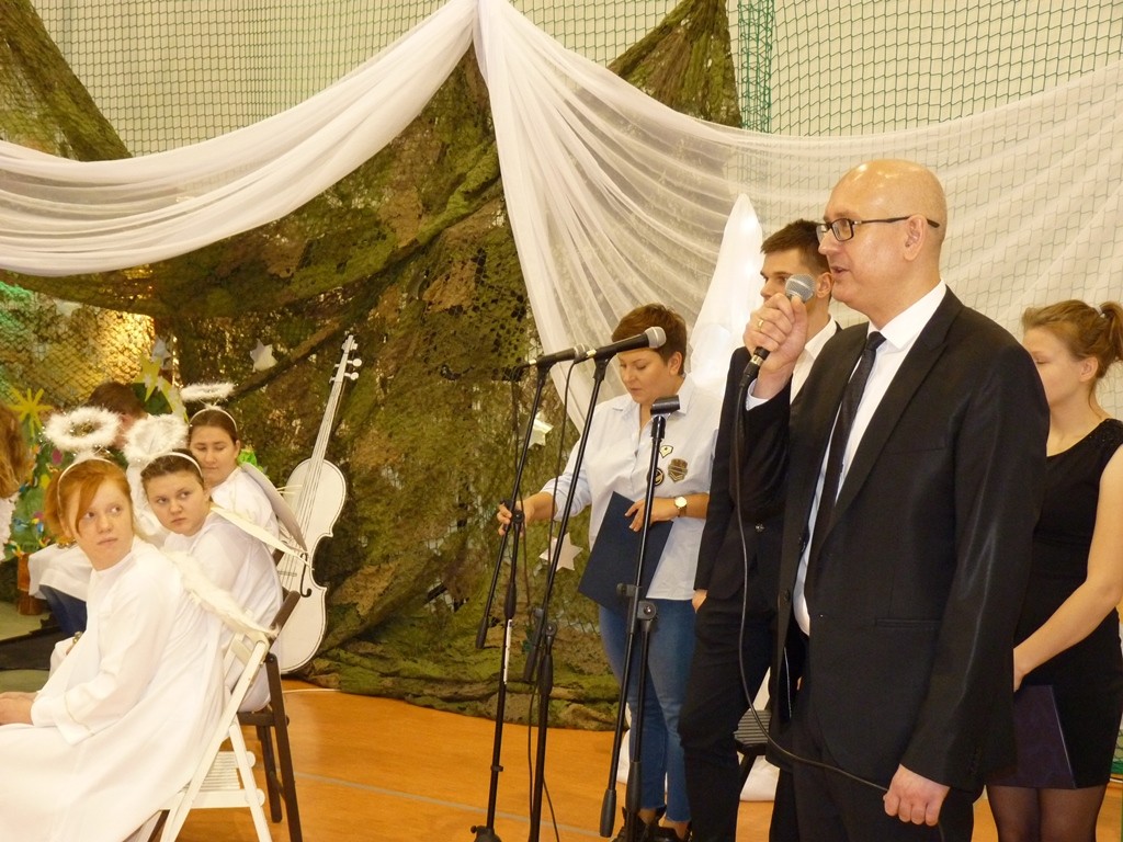 Od wielu lat, ten szczególny dzień przybliża nas w magiczny czas, zwiastuje, że nadchodzi Boże Narodzenie. Dyrektor szkoły Wojciech Maciejewski złożył życzenia świąteczne: uczniom, rodzicom, nauczycielom i pracownikom szkoły. Powitał również przybyłych gości Panią Magdalenę Pędzik – przedstawicielkę organu prowadzącego szkołę – Powiatu Goleniowskiego oraz Pana Prezesa Zarządu GWiK Janusza Dawidziaka.