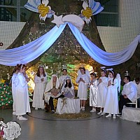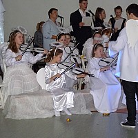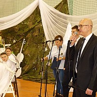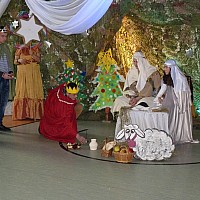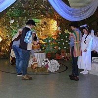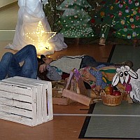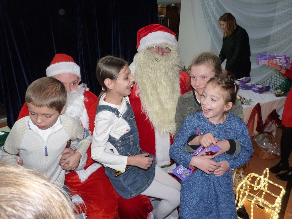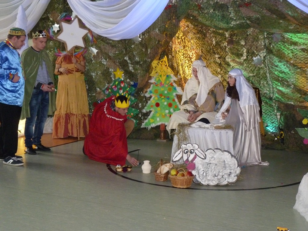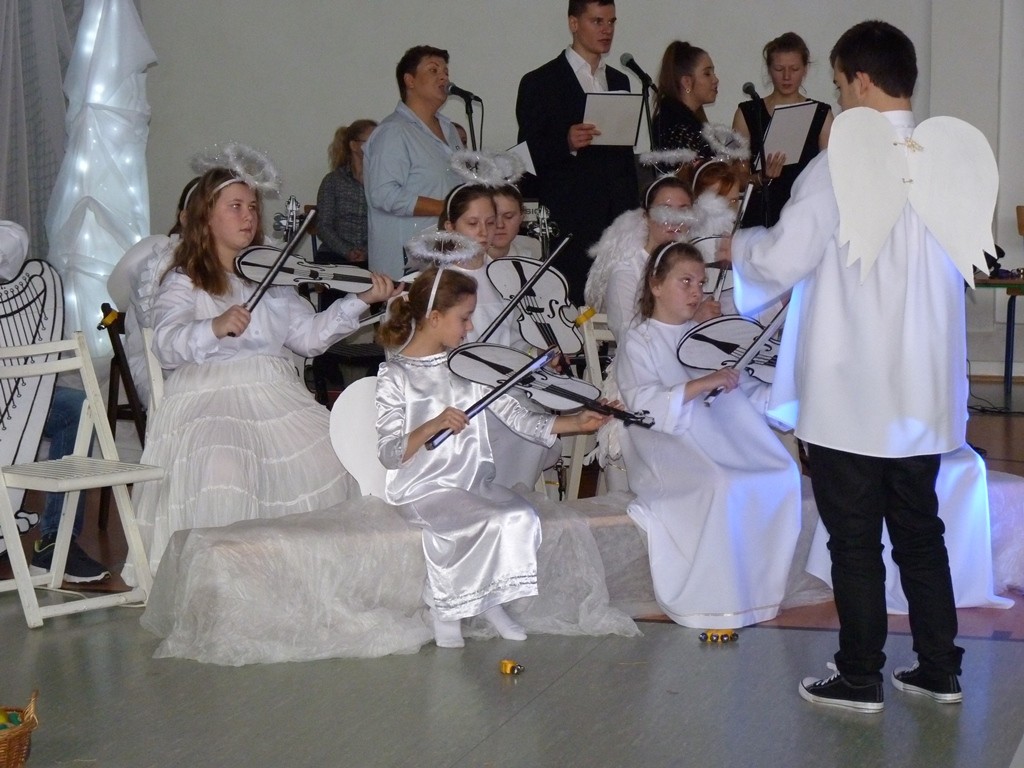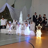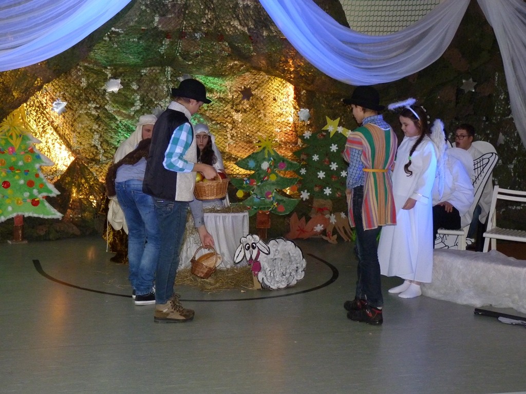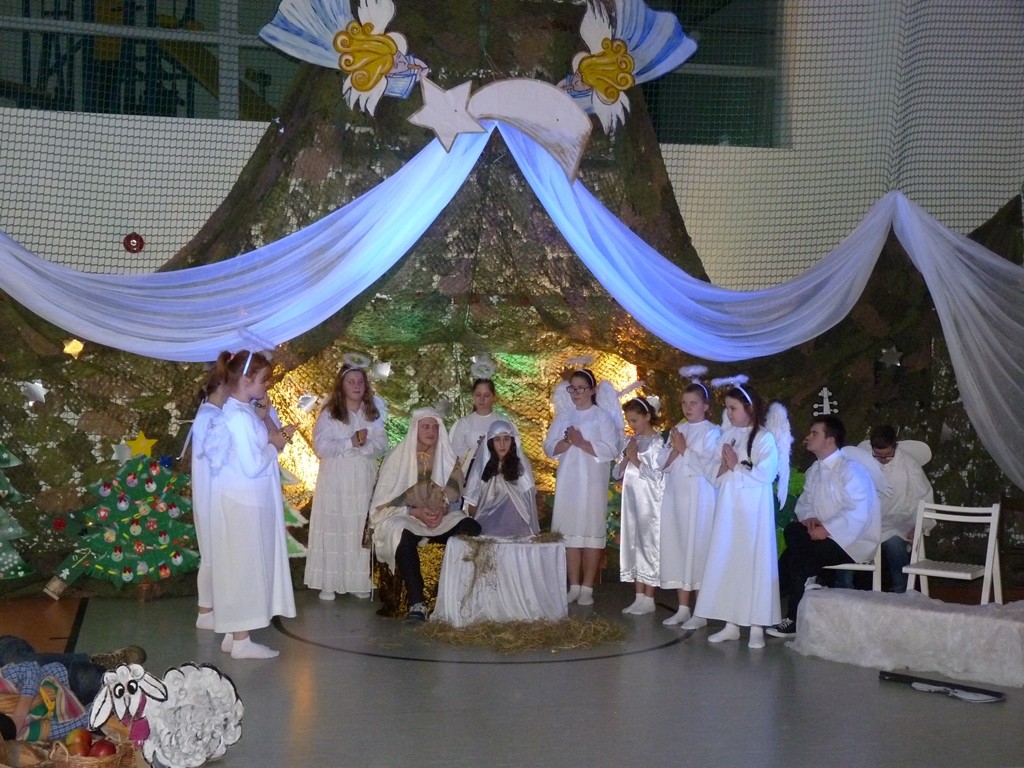Na sali przygaszono światła, nastał półmrok, w kołysce płakała dziecina, a zastęp aniołów jej śpiewał; lili lili laj moje Dzieciąteczko… tak uczniowie rozpoczęli Jasełka, widowisko o Bożym Narodzeniu. W lirycznej aranżacji odśpiewano wiele znanych kolęd. Dzieci, najbardziej nie mogły się doczekać św. Mikołaja, który dotarł z prezentami i pozował z nimi do zdjęć.