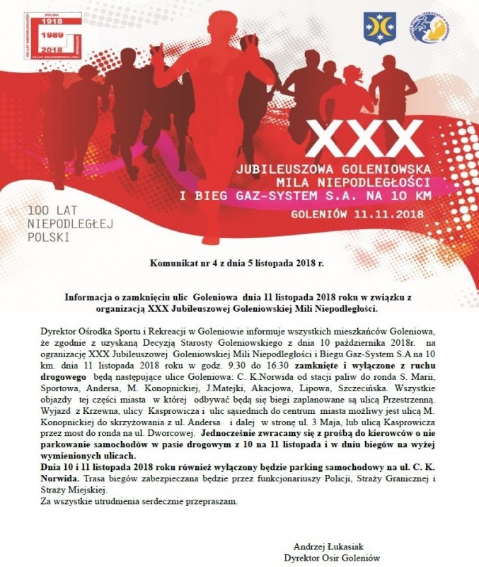» KOMUNIKAT NR 4 Z DNIA 05.11.2018. DOT. ORGANIZACJI XXX JUBILEUSZOWEJ GOLENIOWSKIEJ MILI NIEPODLEGŁOŚCI