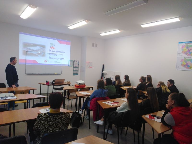 W ramach Europejskiego Tygodnia Umiejętności Zawodowych w ZS nr 1 odbyła się lekcja postaw przedsiębiorczości, którą poprowadzili przedstawiciele Wydziału Rozwoju Lokalnego Funduszy, Kultury i Sportu Urzędu Miejskiego w Nowogardzie. Uczniowie klasy II TE zapoznani zostali z dokumentacją i procesem zakładania działalności gospodarczej, przedstawiona została również Nowogardzka Strefa Ekonomiczna oraz omówiono inwestycje. Każdy z uczniów otrzymał upominek promujący gminę Nowogard. Bardzo dziękujemy za odwiedziny i do zobaczenia za rok!