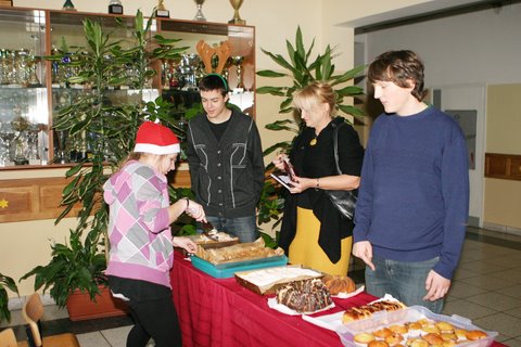 W czasie przerw, na szkolnym korytarzu, przy dźwiękach świątecznej muzyki pomocnicy Mikołaja przeprowadzili szkolną aukcję mikołajkową oraz obdarowywali wszystkich zainteresowanych pysznymi ciastami. W tym roku dochód z aukcji uczniowie postanowili przeznaczyć na rehabilitację kilkuletniego chłopca, który uległ wypadkowi w ubiegłym miesiącu.