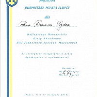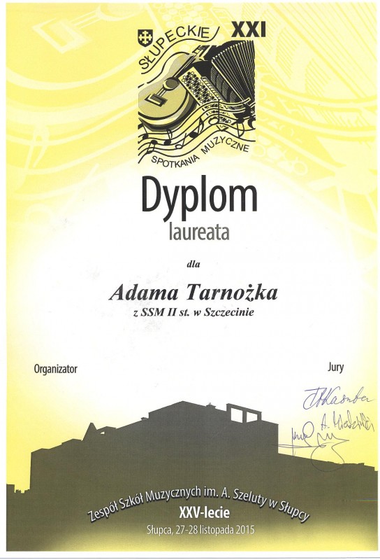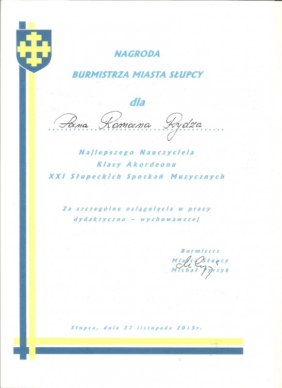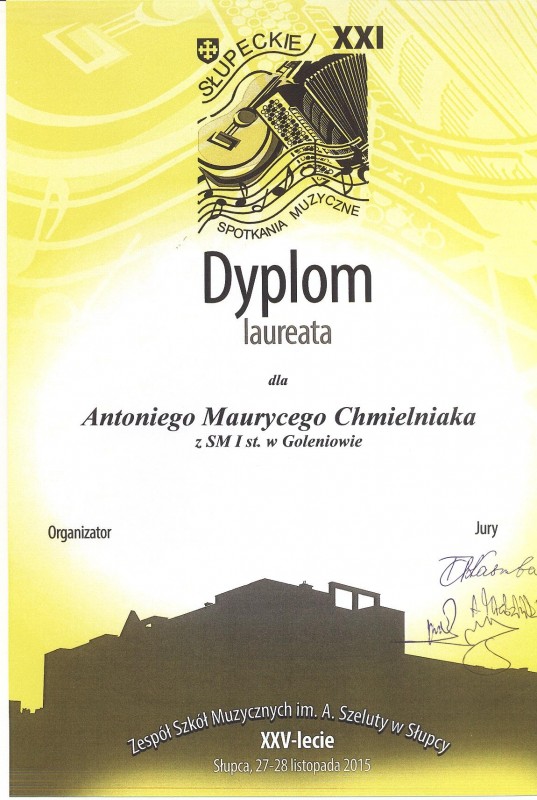 W dniach 27-28 XI 2015 r. goleniowscy akordeoniści wraz ze swoim Mistrzem, Panem Romanem Rydzem, zabłysnęli talentami uczestnicząc w XXI Słupeckich Spotkaniach Muzycznych. Nauczyciel chłopców za ich znakomite przygotowanie do konkursu zdobył Nagrodę Burmistrza Słupcy i tytuł Najlepszego Nauczyciela Klasy Akordeonu XXI Słupeckich Spotkań Muzycznych.