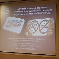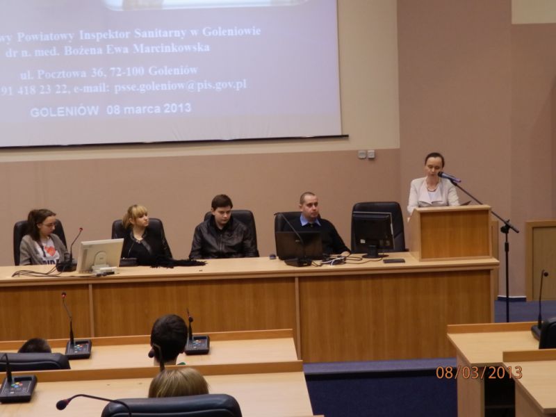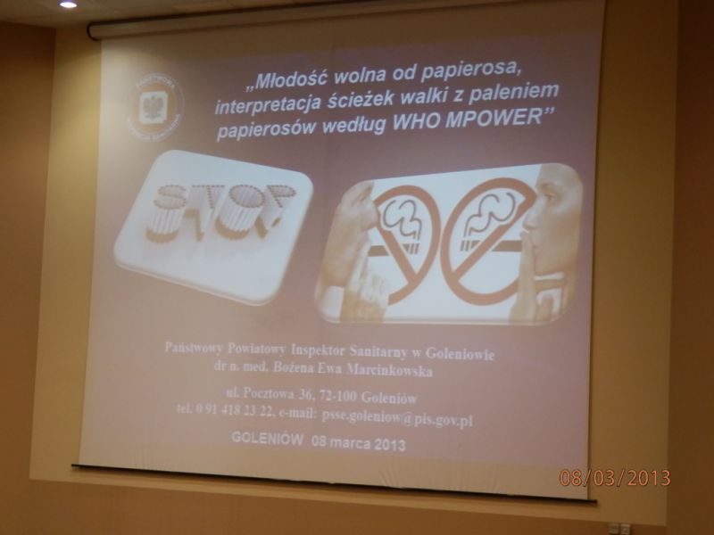 W dniu 08.03.2013r. w Sali konferencyjnej Urzędu Gminy i Miasta w Goleniowie odbyła się konferencja szkoleniowa zorganizowana przez Państwowego Powiatowego Inspektora Sanitarnego w Goleniowie dr n. med. Bożenę Ewę Marcinkowską pt.: „Młodość wolna od papierosa, interpretacja ścieżek walki z paleniem papierosów według WHO MPOWER”.