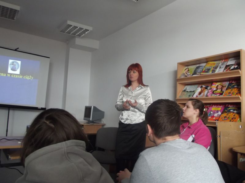 Starsi uczniowie szkoły uczestniczyli w prelekcji na temat bezpiecznego seksu oraz higieny okresu ciąży. Panie, które zawodowo pomagają ciężarnym oraz młodym matkom i ich maluszkom opowiedziały nam o antykoncepcji. Dowiedzieliśmy się, że istnieje cała gama różnych środków, które zabezpieczają przed niechcianą ciążą oraz chorobami zakaźnymi.