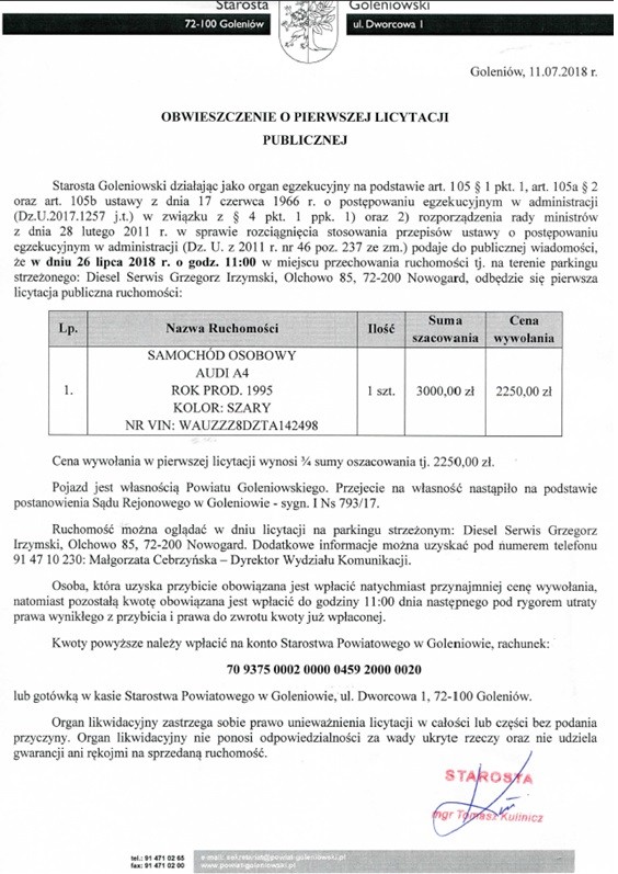 OBWIESZCZENIE O PIERWSZEJ LICYTACJI PUBLICZNEJ