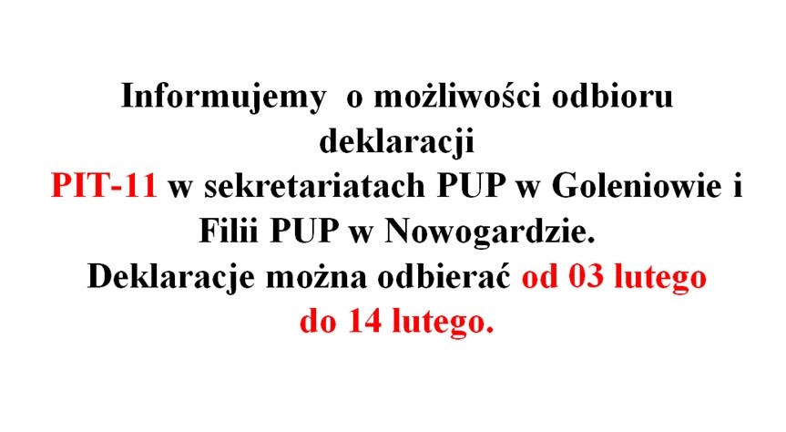 Informujemy o możliwości odbioru deklaracji podatkowych PIT-11 w Powiatowym Urzędzie Pracy w Goleniowie i Fili w Nowogardzie.