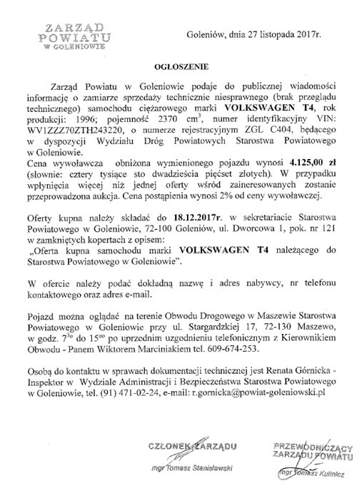 OGŁOSZENIE ZARZĄDU POWIATU W GOLENIOWIE
