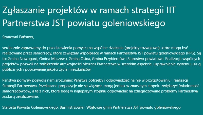 Serdecznie zapraszamy Państwa do przedstawienia pomysłu na wspólne działania (projekty rozwojowe), które mogą być realizowane przez samorządy Partnerstwa. Realizacja wspólnych projektów pozwoli na zwiększenie atrakcyjności naszego obszaru, usprawnienie systemu usług publicznych i zwiększenie jakości życia mieszkańców.