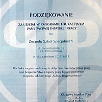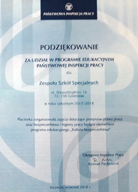 W dniu 4 października 2018 roku odbyło się podsumowanie realizacji Programu Edukacyjnego Państwowej Inspekcji Pracy ,, Kultura bezpieczeństwa”. Celem realizacji programu było zapoznanie uczniów z bezpieczeństwem i higieną pracy oraz przedstawienie młodzieży prawa jakie im przysługują w pracy. Uczniowie Zespołu Szkół w Goleniowie aktywnie uczestniczyli w programie i przyswajali założone cele.