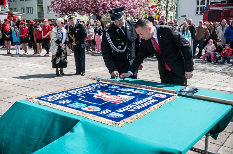 Uroczysty apel rozpoczął się od złożenia meldunku Zachodniopomorskiemu Komendantowi Wojewódzkiemu Państwowej Straży Pożarnej w Szczecinie nadbryg. Henrykowi Cegiełce. Następnie odbyła się ceremonia wręczenia sztandaru dla Oddziału Powiatowego Związku Ochotniczych Straży Pożarnych RP w Goleniowie.