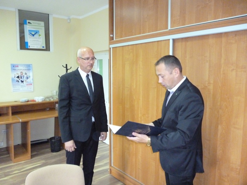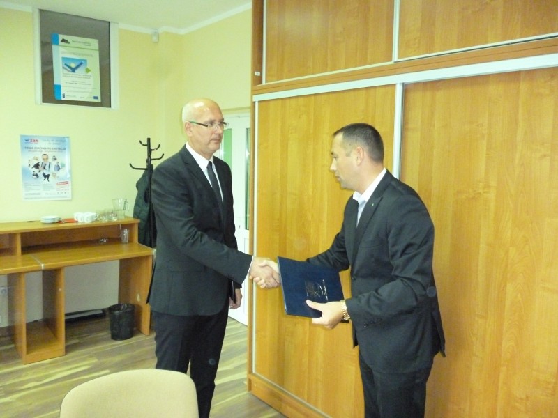 Starosta Goleniowski Tomasz Kulinicz na posiedzeniu Zarządu Powiatu w dniu 29 lipca 2015 roku uroczyście wręczył panu Wojciechowi Maciejewskiemu akt powierzenia pełnienia obowiązków dyrektora Zespołu Szkół Specjalnych w Goleniowie na okres 10 mięsięcy od dnia 1 sierpnia 2015 roku. Po przyjęciu gratulacji od zgromadzonych na posiedzeniu osób, pan Maciejewski podziękował za to wyróżnienie i w kilku słowach przedstawił swoje plany na najbliższe tygodnie funkcjonowania szkoły.