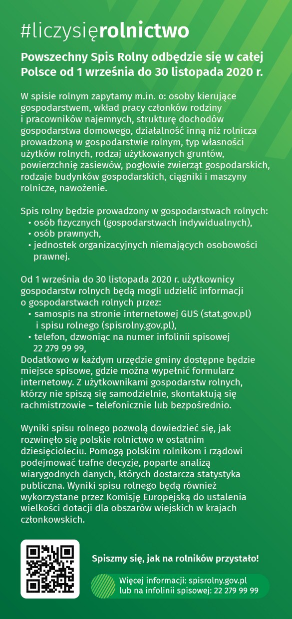 Statystyka publiczna zapewnia rzetelne, obiektywne i systematyczne informowanie społeczeństwa, organów państwa i administracji publicznej oraz podmiotów gospodarki narodowej o sytuacji ekonomicznej, demograficznej, społecznej oraz środowiska naturalnego. Wypełnienie tego zobowiązania gwarantuje m.in. realizacja spisów rolnych.
