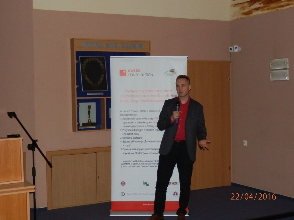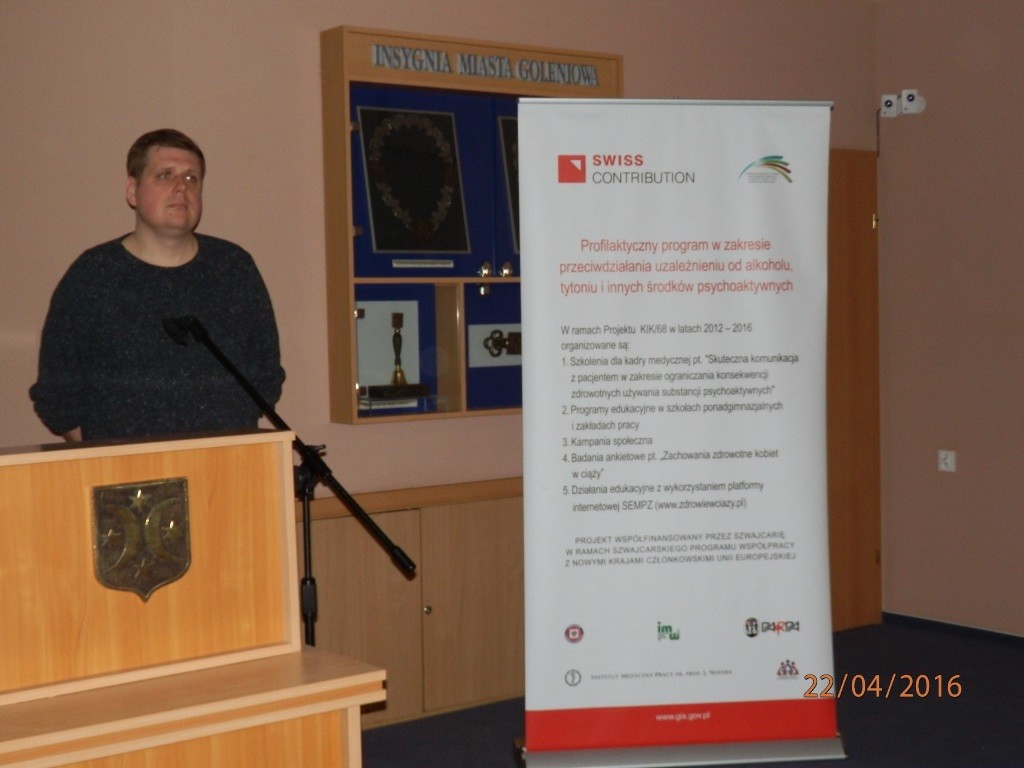 W dniu 22.04.2016 r. w sali konferencyjnej Urzędu Gminy i Miasta w Goleniowie odbyła się konferencja dla środowiska szkolnego w ramach Projektu KIK/68 „Profilaktyczny program w zakresie przeciwdziałania uzależnieniu od alkoholu, tytoniu i innych środków psychoaktywnych” zorganizowana przez Państwowego Powiatowego Inspektora Sanitarnego w Goleniowie dr n. med. Bożenę Ewę Marcinkowską.