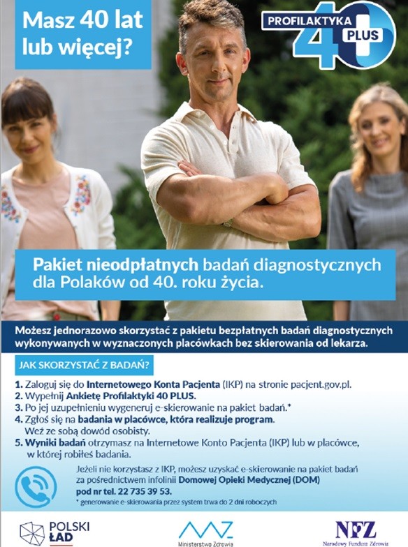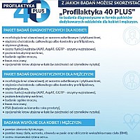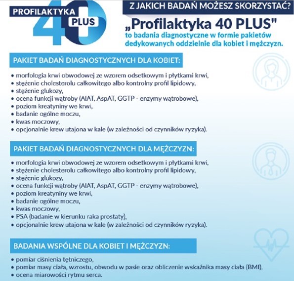 Profilaktyka 40PLUS zakłada realizację badań diagnostycznych w formie pakietów dedykowanych oddzielnie dla kobiet i mężczyzn oraz pakietu wspólnego. Głównym celem programu zdrowotnego jest profilaktyka chorób z powodu obniżonej zgłaszalności do lekarzy w 2020 r. w związku z pandemią koronawirusa. Wiele chorób, zwłaszcza w swoim początkowym stadium rozwoju, nie daje niepokojących objawów. Dzięki badaniom profilaktycznym można wykryć chorobę bardzo wcześnie i uniknąć długotrwałego, a czasem nieskutecznego leczenia, które jest konsekwencją zbyt późnej diagnozy.