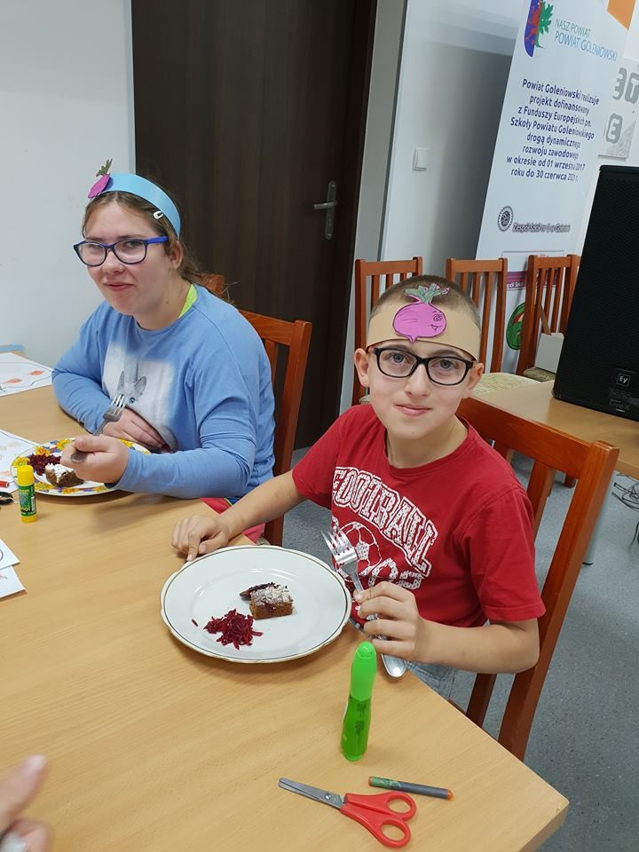 W piątek 26.10.2018r w Zespole Szkół w Goleniowie najmłodsi uczniowie uczestniczyli w imprezie Dzień Buraka- promującej zdrowe odżywianie. Po obejrzeniu prezentacji multimedialnej uczniowie przystąpili do realizacji przygotowanych zadań. Musieli wykazać zdobytą wiedzą, umiejętnościami matematycznymi, a także spostrzegawczością przy układaniu puzzli. Po wspólnych zmaganiach i konkurencjach przyszedł czas na poczęstunek przygotowany przez uczniów Szkoły Branżowej pod kierunkiem pani Katarzyny Taraski, który oczywiście musiał zgadzać się z tematem imprezy. Zadowolone dzieci zajadały się buraczanym ciastem, surówką z buraka, zapiekanym burakiem, a także chipsami z buraka. Ostatnią atrakcją na imprezie była Foto-budka, która cieszyła się dużym zainteresowaniem uczniów. Imprezę przygotowały i poprowadziły panie Dorota Baczewska i Agnieszka Sućko.