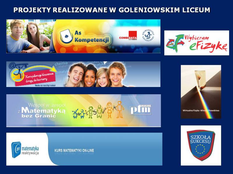 W bieżącym roku szkolnym uczniowie klas I-III Zespołu Szkół Ponadgimnazjalnych I Liceum Ogólnokształcącego im. Stefana Żeromskiego w Goleniowie uczestniczyli w zajęciach 7 projektów współfinansowanych ze środków Unii Europejskiej w ramach Europejskiego Funduszu Społecznego. Były to: „ As Kompetencji” (dodatkowe zajęcia z fizyki i podstaw przedsiębiorczości), „Wespół w Zespół z Matematyką bez Granic” (zajęcia z matematyki), „Kompetencje kluczowe drogą do kariery” (zajęcia z matematyki, fizyki, biologii i chemii), „Szkoła Sukcesu” (zajęcia z języka angielskiego z elementami Business English i przedsiębiorczości), „Wybieram e-fizykę”, „Wirtualna Fizyka - Wiedza Prawdziwa” (zajęcia z fizyki) oraz „Matematyka Reaktywacja” (zajęcia z matematyki).