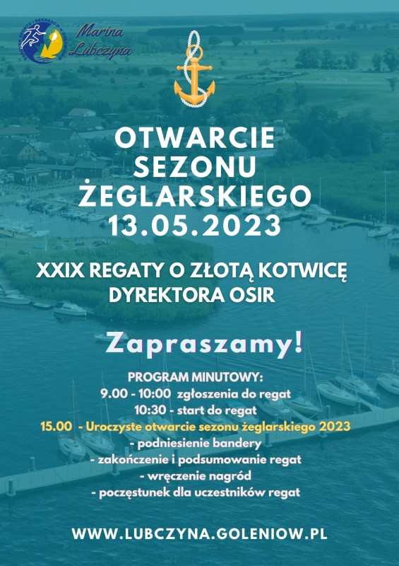 W najbliższą sobotę - 13 maja 2023 roku odbędą się Towarzyskie Regaty będące otwarciem sezonu w Lubczynie, które zostaną zorganizowane na akwenie Jeziora Dąbie. Start i meta – Marina Lubczyna.