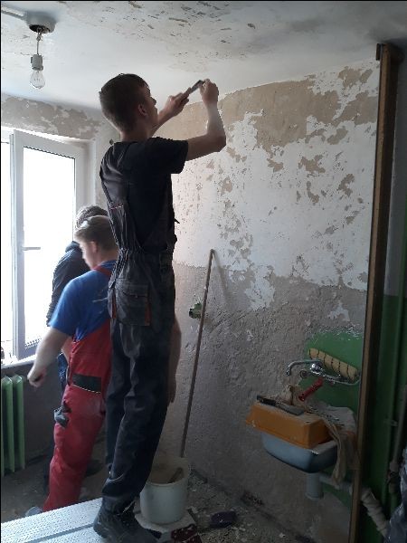 Projekt realizowany od września 2017r. w ramach Działania RPZP.08.06.00 Wsparcie szkół i placówek prowadzących kształcenie zawodowe oraz uczniów uczestniczących w kształceniu zawodowym i osób dorosłych uczestniczących w pozaszkolnych formach kształcenia zawodowego przynosi bardzo korzystne efekty zarówno dla uczestników projektu jak i placówki. Przykładem jest wykorzystanie umiejętności nabytych podczas zajęć praktycznych u pracodawcy w pracach remontowych na terenie placówki. Pod opieką nauczyciela zawodu pana Adama Żywickiego, który prowadzi również zajęcia praktyczne wynikające z zakresu przedmiotowego uczniowie w kierunku Monter zabudowy i robot wykończeniowych w budownictwie potrafią wykonać prace remontowe w pomieszczeniach szkolnych od podstaw po wykończeniówkę. Nie jest to łatwa praca i wymaga wiedzy, siły, cierpliwości i chęci, Nabyte umiejętności spowodują, że uczniowie ci będą atrakcyjnymi pracownikami na rynku pracy po zakończeniu nauki w szkole. Już dziś spotykają się z propozycjami pracy co stanowi bodziec do dalszego kształcenia w zawodzie. Projekt umożliwia dokonanie zapłaty uczniom za zrealizowane godziny zajęć praktycznych co jest dodatkową motywacją do rzetelnej pracy.