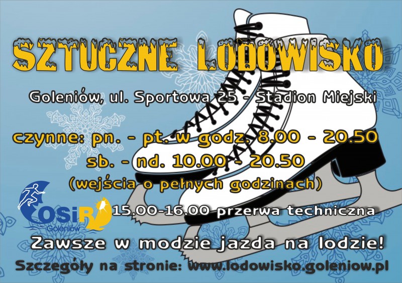 Dyrektor Ośrodka Sportu i Rekreacji zaprasza wszystkich do jazdy na łyżwach na sztucznym lodowisku przy ul. Sportowej 25 – Stadion Miejski Goleniów.