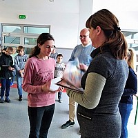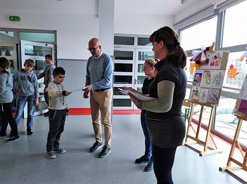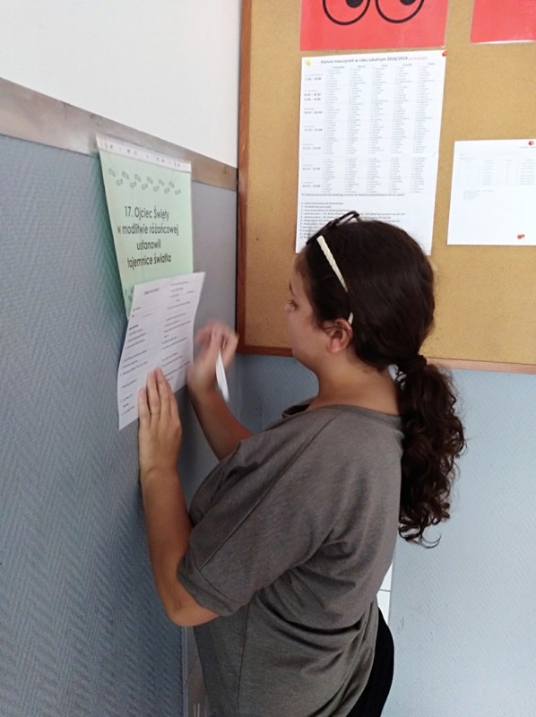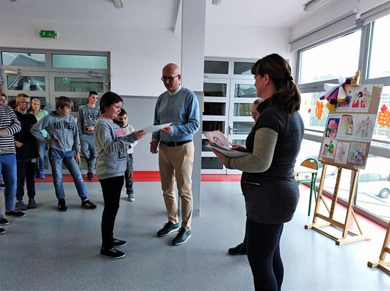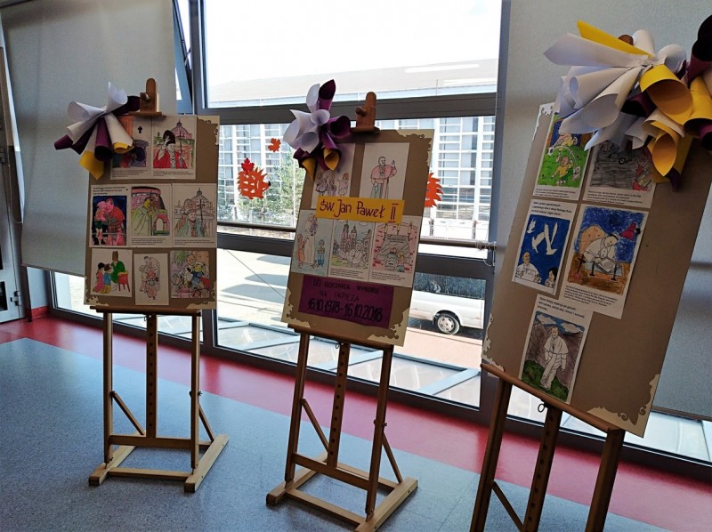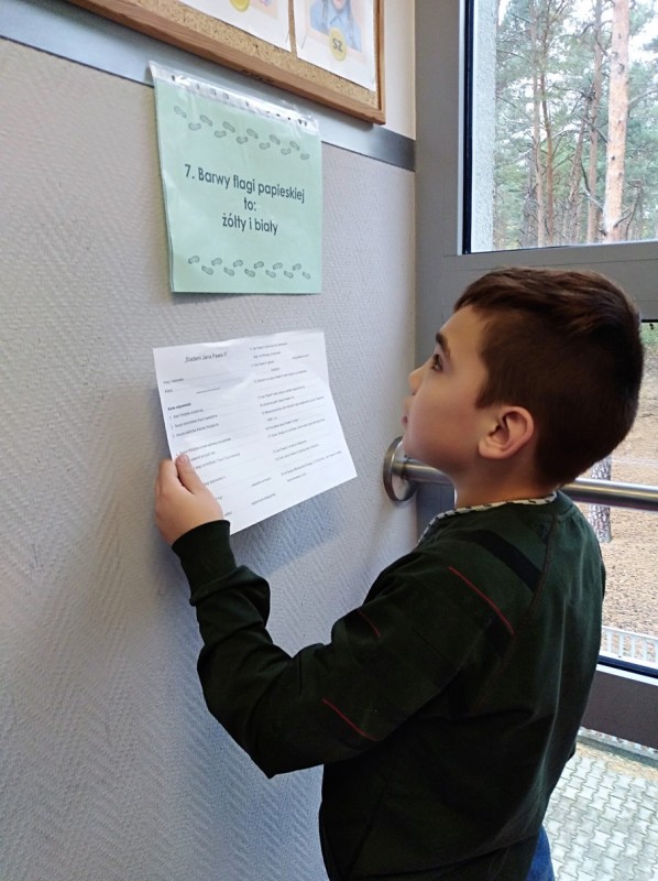 „Śladami Jana Pawła II” – pod takim hasłem obchodziliśmy w tym roku 40. rocznicę wyboru Karola Wojtyły na Stolicę Piotrową. Tegoroczne świętowanie rozpoczęliśmy 16. października, kiedy to w murach naszej szkoły gościliśmy s. Casty, która – przybliżając nam pracę misjonarzy w Kenii – opowiedziała nam również o swoim osobistym spotkaniu z naszym Papieżem. W kolejnych dniach chętni uczniowie wykonali prace plastyczne przedstawiające ważniejsze wydarzenia z życia Jana Pawła II. Wiele z tych prac mogliśmy oglądać na szkolnej wystawie. W międzyczasie na lekcjach religii miały miejsce m. in. projekcje filmów, quizy, pogadanki, czytanie fragmentów wybranych dokumentów i dzieł literackich napisanych przez Papieża – Polaka. Uczniowie mieli również możliwość zapoznania się z listem, który św. Jan Paweł II, jako jedyny papież, napisał specjalnie do dzieci.