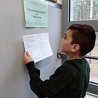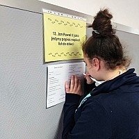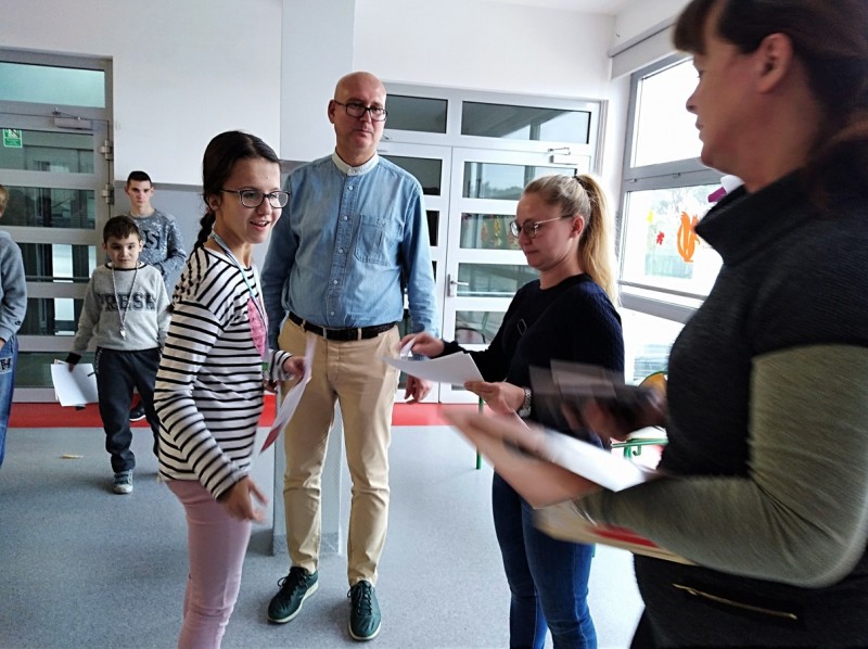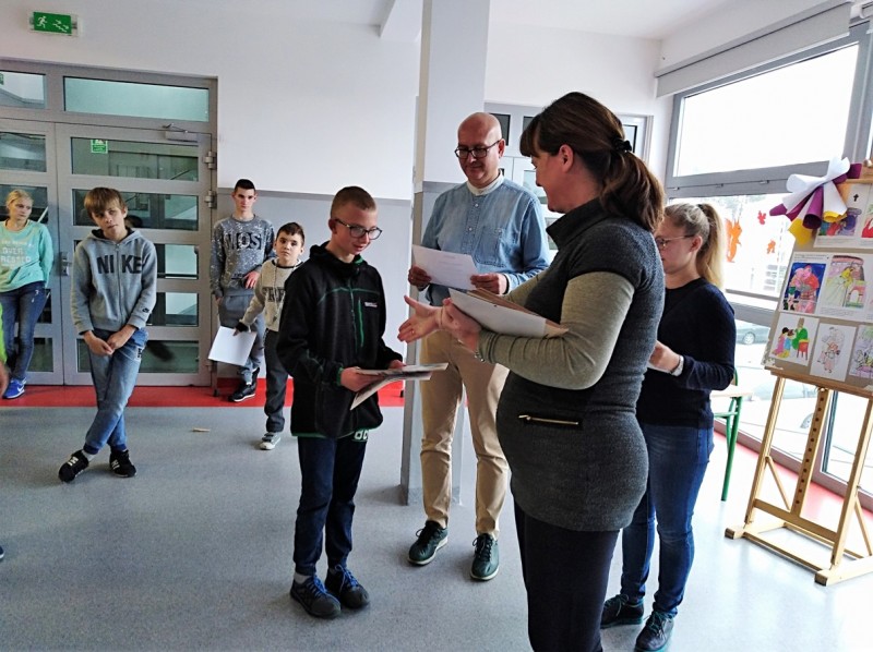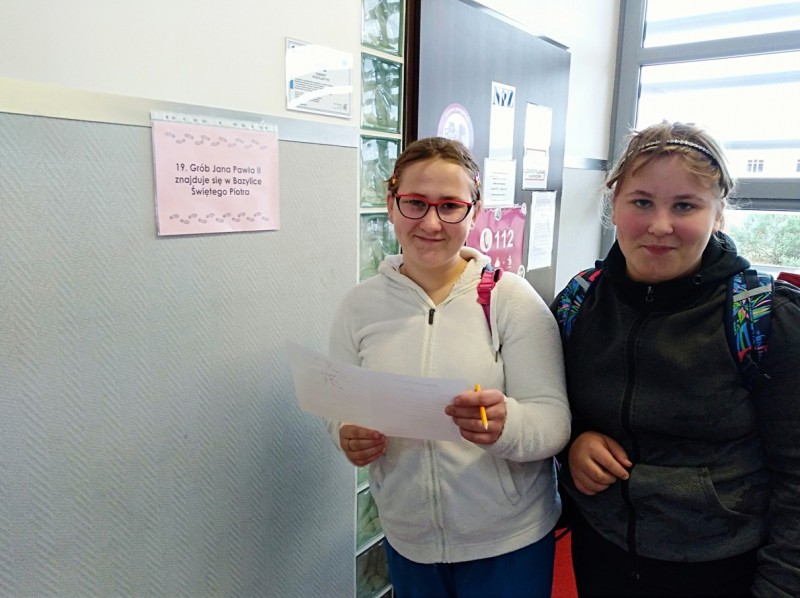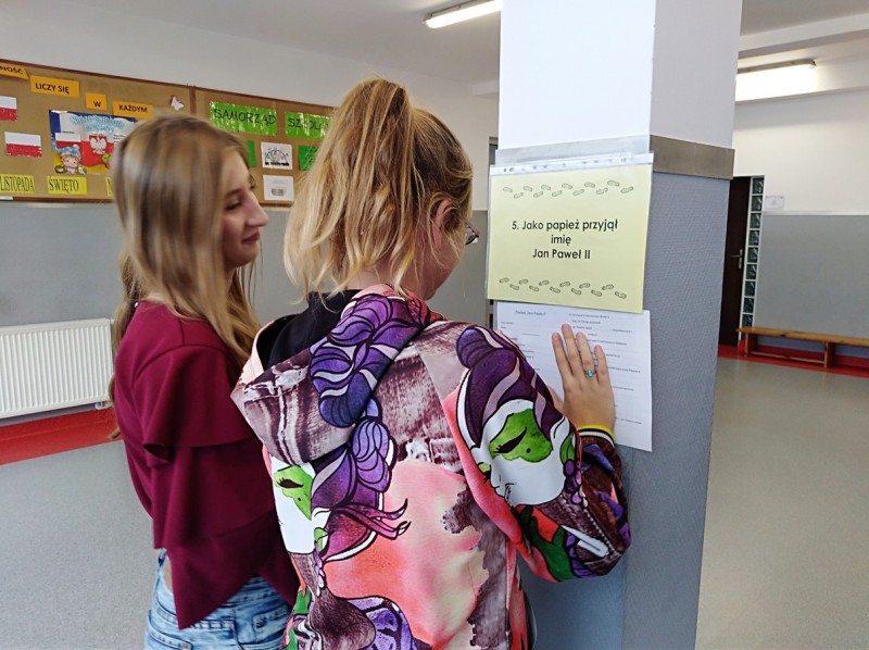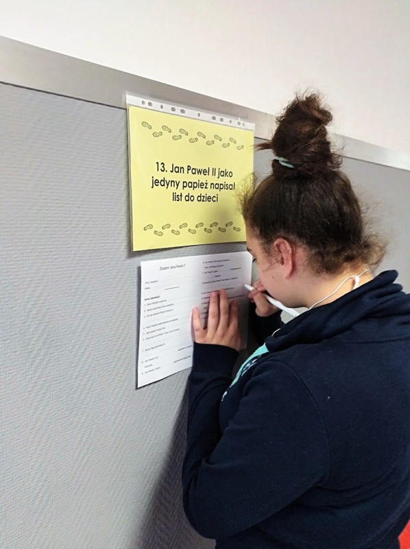 Zwieńczeniem naszego szkolnego świętowania był konkurs wiedzy o świętym Janie Pawle II pt. „Śladami Jana Pawła II”, przygotowany w formie „gry terenowej”. Każdy uczestnik konkursu otrzymał kartę uczestnika konkursu. Zadaniem jego było uzupełnić tekst na karcie konkursowej o brakujące informacje, które były rozwieszone w ogólnodostępnych miejscach na terenie budynku szkoły. Wygrywał ten, komu to się udało.