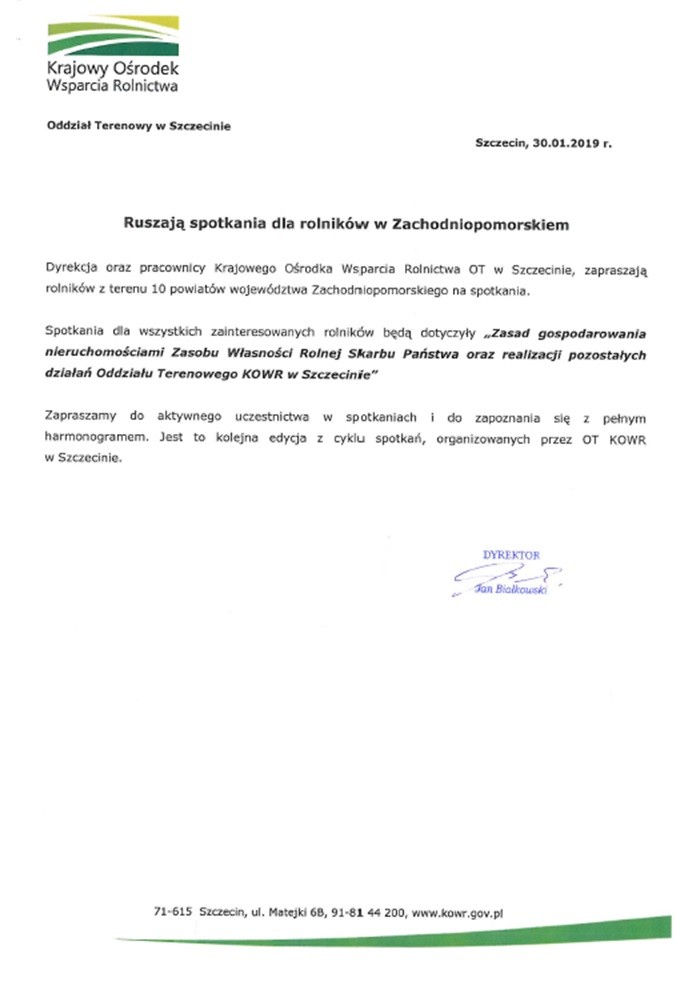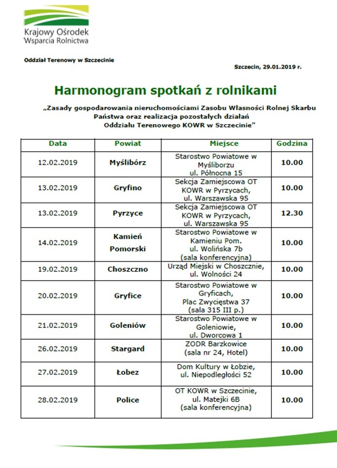 Krajowy Ośrodek Wsparcia Rolnictwa OT w Szczecinie zaprasza rolników z terenu powiatu goleniowskiego na spotkanie dotyczące "Zasad gospodarowania nieruchomościami Zasobu Własności Rolnej Skarbu Państwa oraz realizacji pozostałych działań Oddziału Terenowego KOWR w Szczecinie".