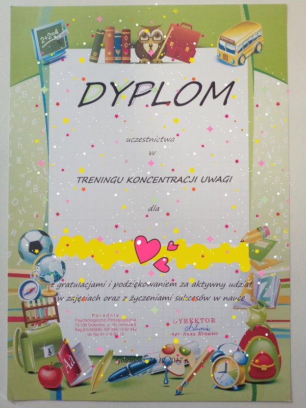27 listopada zakończyliśmy kolejna edycję Treningu koncentracji uwagi. Podobnie jak wcześniej zajęcia odbywały się raz w tygodniu. Każde spotkanie trwało 2 godziny lekcyjne. Frekwencja była wysoka, wynosiła 90%. Program zajęć, opracowany przez psycholog Barbarę Stańczuk, z nieznacznymi zmianami wprowadzonymi przez prowadzącą zajęcia, został zrealizowany w pełnym zakresie. Na warsztatach wykorzystywano różne formy pracy. Podobnie jak we wcześniejszych edycjach pewne problemy sprawiały uczniom ćwiczenia dotyczące przekształceń słownych (Dodaj, opuść lub zamień jedną literę tak, aby powstało inne słowo; Przestaw litery tak, by powstało słowo; Zgadnij co powiedziałam?). Na ostatnim spotkaniu dzieci przekazały rodzicom informacje na temat niektórych ćwiczeń, wspólnie z nimi wykonały przykładowe zadanie. W podsumowaniu zwrócono uwagę na potrzebę doskonalenia koncentracji uwagi jako warunku koniecznego do nabywania postępów w nauce. Wręczając Dyplomy podziękowano dzieciom za aktywność oraz przekazano zgromadzone w skoroszytach materiały warsztatowe.