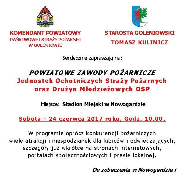 » STAROSTA GOLENIOWSKI SERDECZNIE ZAPRASZA NA POWIATOWE ZAWODY POŻARNICZE