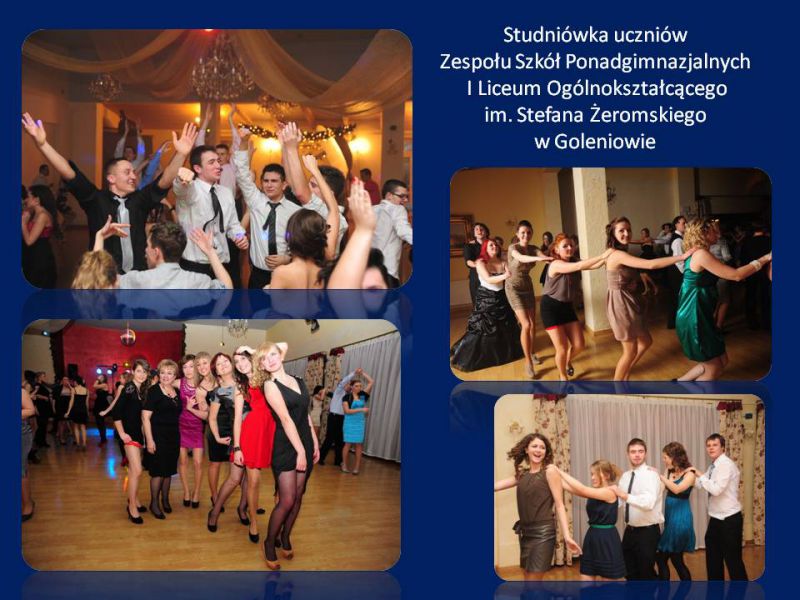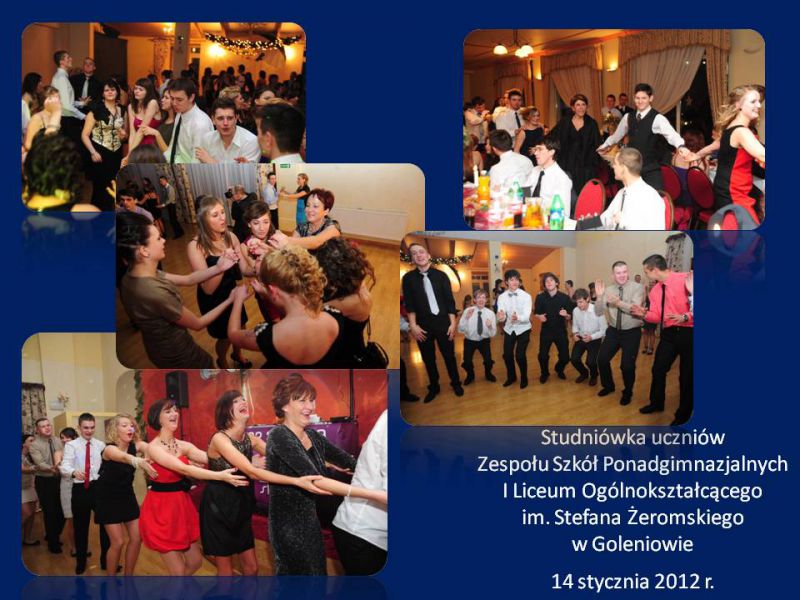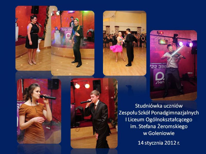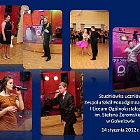 Przyszedł dzień Ich pierwszego i najważniejszego w życiu balu – Studniówki. Na tę szczególną uroczystość do Hotelu JF Duet w Goleniowie przybyli zaproszenia goście, rodzice, dyrekcja, grono pedagogiczne i młodzież goleniowskiego liceum. Tradycyjnie bal rozpoczęto częścią oficjalną przygotowaną przez uczniów klasy III B (w roli prowadzących Joanna Sawicka i Krzysztof Olobry), pod opieką wychowawcy pani Ewy Łuczak. Były podziękowania skierowane dla dyrekcji, wychowawców i rodziców ze strony uczniów. Dyrektor szkoły pani Agata Markowicz-Narękiewicz dokonała oficjalnego otwarcia Balu Studniówkowego 2012 i magiczną formułą: „Poloneza czas zacząć” zaprosiła tegorocznych maturzystów do rozpoczęcia studniówki tradycyjnym staropolskim tańcem.