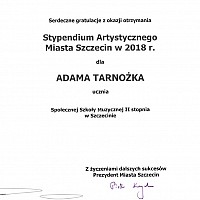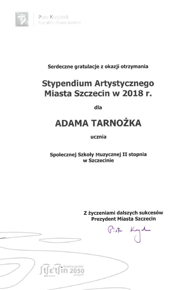 Adam Tarnożek 15 XI 2018 r. otrzymał Dyplom gratulacyjny z okazji otrzymania Stypendium Miasta Szczecin za osiągnięcia artystyczne uzyskane w roku szkolnym 2017/2018. Uroczystość wręczenia dyplomów odbyła się w Zespole Szkół Muzycznych nr 2 w Szczecinie. Prezydent Miasta Szczecin Piotr Krzystek co roku przyznaje stypendia artystyczne uczniom szczecińskich szkół, docenia wyjątkowe młode talenty za wybitne osiągnięcia o zasięgu międzynarodowym, ogólnopolskim i regionalnym oraz działania na rzecz miasta i jego mieszkańców. Do Urzędu Miasta Szczecin wpłynęły 73 wnioski, które były wnikliwie rozpatrywane przez specjalnie powołaną komisję, z czego pozytywnie rozpatrzono 33 wnioski i przyznano stypendia w wysokości od 2 266 zł do 3 800 zł (łącznie to 100 tys. zł). Na wyróżnienie zasłużył Adam - uczeń Pana Romana Rydza uczęszczający do V klasy Społecznej Szkoły Muzycznej II st. w Szczecinie i IV klasy Technikum Nr 1 w Zespole Szkół nr 1 w Goleniowie.