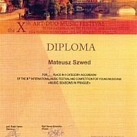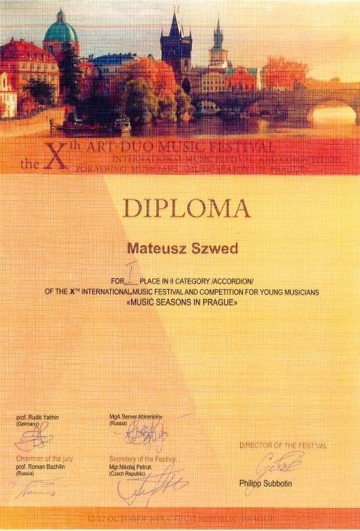 Chłopcy - uczniowie Romana Rydza w dniach 12-17 X 2015 r. byli uczestnikami Międzynarodowego Konkursu Akordeonowego w Pradze. Zaprezentowali swoje programy artystyczne na bardzo wysokim poziomie za co otrzymali ogromne brawa publiczności i zostali wysoko ocenieni przez międzynarodowe Jury: