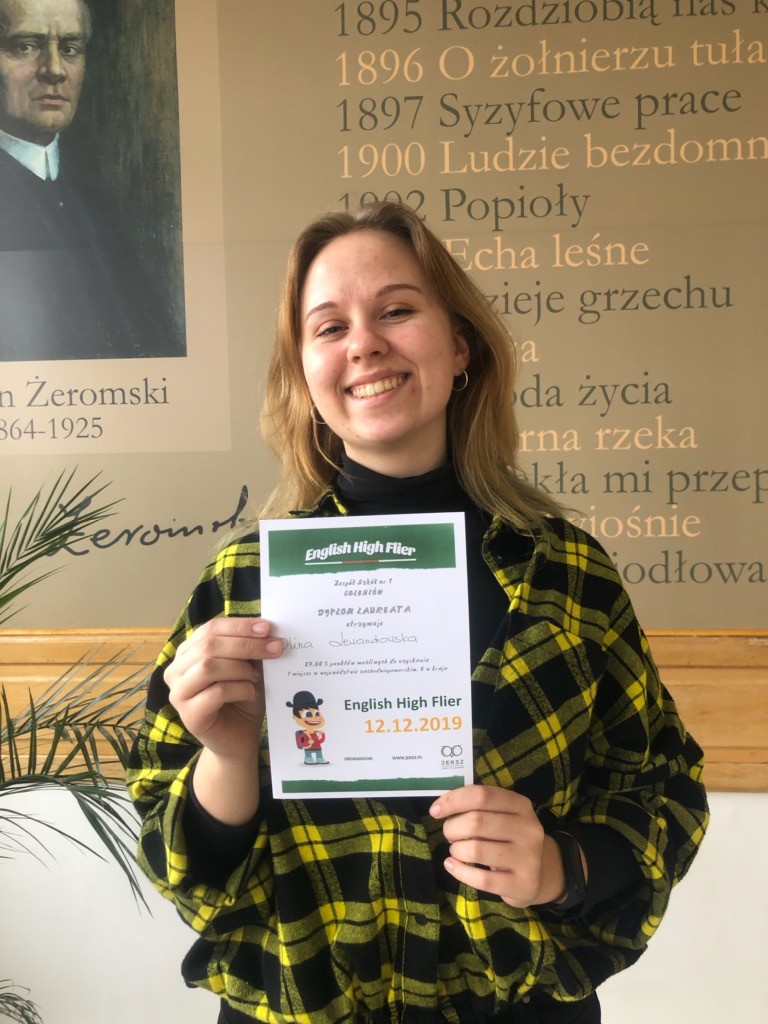 Dnia 12 grudnia 2019 roku w Zespole Szkół nr 1 w Goleniowie odbyła się XIX edycja konkursu z języka angielskiego English High Flier. Miło nam poinformować, że wśród osób wyróżnionych znalazła się uczennica naszej szkoły Olina Lewandowska z klasy III LC, która zdobyła 1 miejsce w województwie i 5 miejsce w kraju. Gratulujemy Olino i życzymy kolejnych, równie spektakularnych sukcesów!!!!
