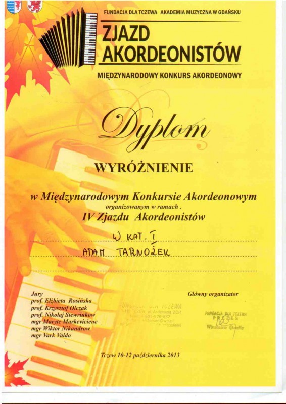 W dniach 10-12 października 2013 r. w Tczewie odbył się IV Zjazd Akordeonistów i Międzynarodowy Konkurs Akordeonowy, w którym udział wzięło 100 akordeonistów z Polski i zagranicy. Do konkursu, który odbył się w 1 dniu Zjazdu zgłosili się akordeoniści z 33 miast z 9 krajów: Niemiec, Czech, Rosji, Litwy, Łotwy, Estonii, Białorusi, Republiki Mołdawii i Polski.