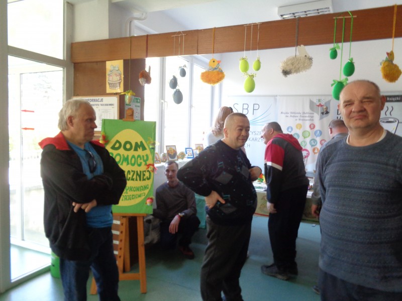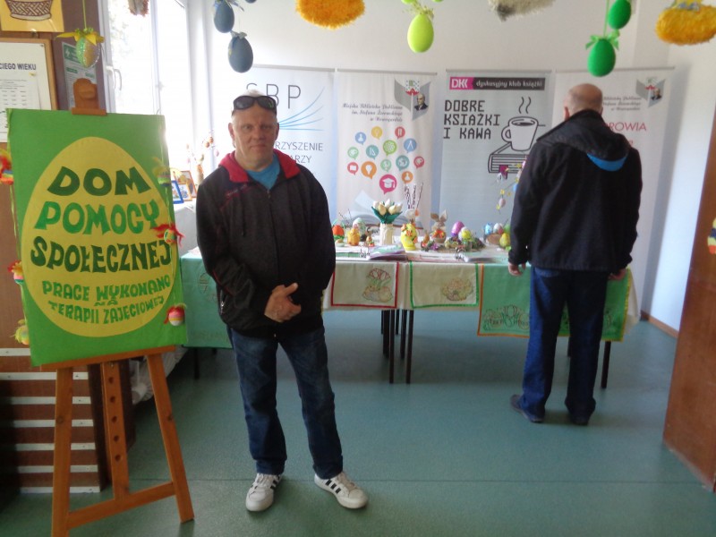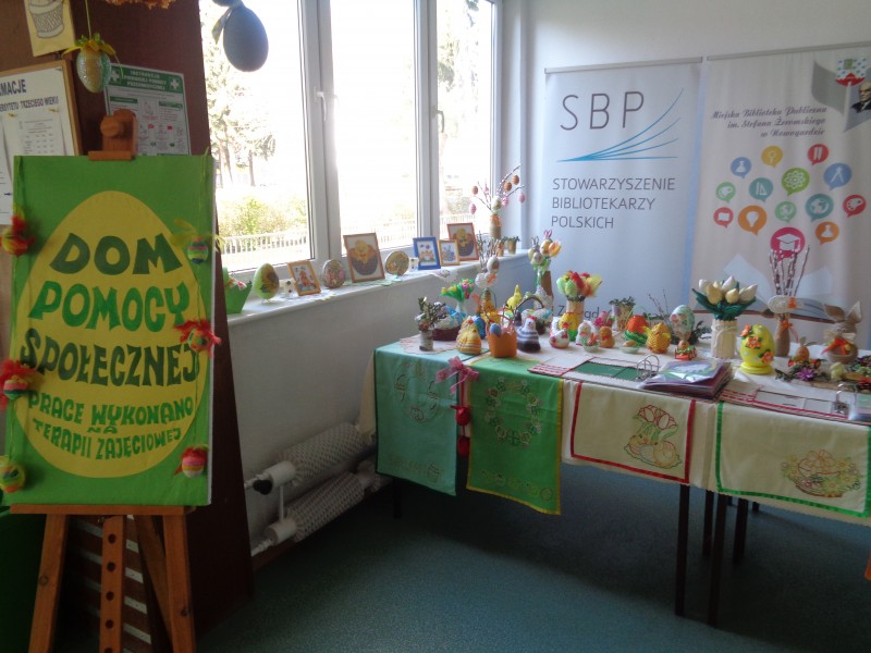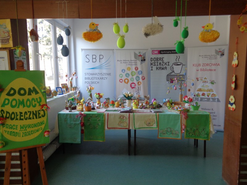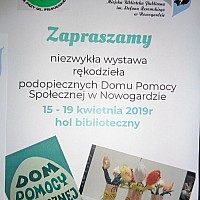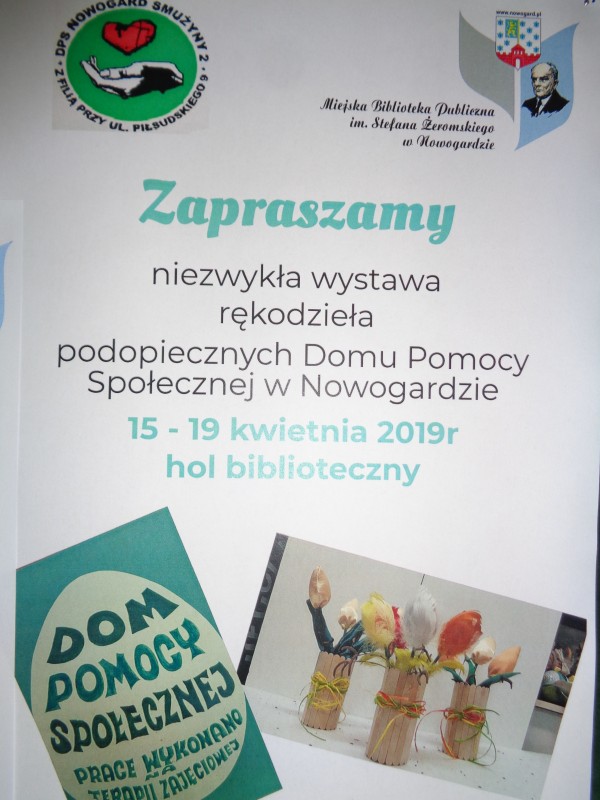 W dniach od 15 – 19 kwietnia 2019r. w Miejskiej Bibliotece Publicznej w Nowogardzie odbyła się świąteczna wystawa rękodzieła Mieszkanek i Mieszkańców Domu Pomocy Społecznej w Nowogardzie. Na stoisku znalazły się m.in. zdobione jajka styropianowe, obrusy z motywem świątecznym, kartki z życzeniami oraz inne ozdoby świąteczne.
