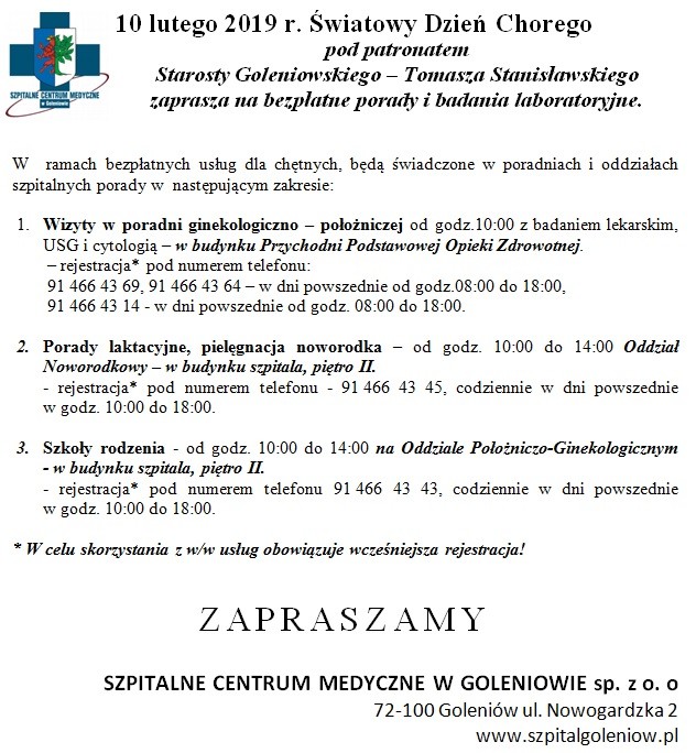 Zapraszamy do Szpitalnego Centrum Medycznego w Goleniowie w dniu 10 lutego 2019 r.