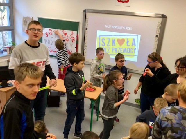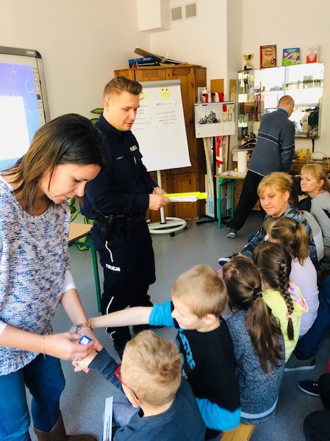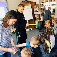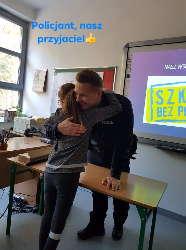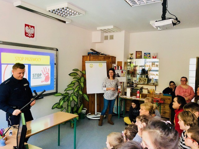W ramach edukacji w tym kierunku zaprosiliśmy policjantów z Komendy Powiatowej Policji w Goleniowie, którzy spotkali się z uczniami klas. Policjanci rozmawiali z dziećmi o przemocy : czym jest, jakie są jej rodzaje, jak na nią reagować, do kogo się zgłościć o pomoc a także jakie są skutki karne dla osób stosujących przemoc wobec innych. W tle pogadanki dzieci miały możliwość obserwować adekwatną do tematu prezentację, obrazowo przedstawiającą problem przemocy.