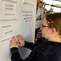 W tym dniu także uczniowie klas starszych przygotowali happening – szkoła bez przemocy. Na transparentach można było zobaczyć hasła potępiające zachowania agresywne. Spotkanie uświetnił pokaz, przyniesionych przez naszych gości, podstawowych akcesoriów policjanta. Dzieci mogły obejrzeć kajdanki oraz pałkę policyjną. Wierzymy, że dzięki takim spotkaniom i naszej świadomości nasza szkoła będzie SZKOŁĄ BEZ PRZEMOCY.