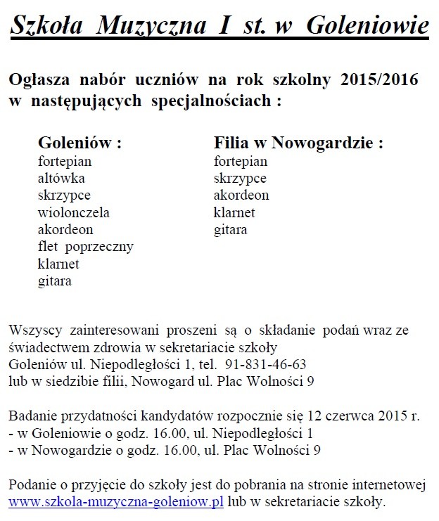 Szkoła Muzyczna I stopnia w Goleniowie ogłasza nabór