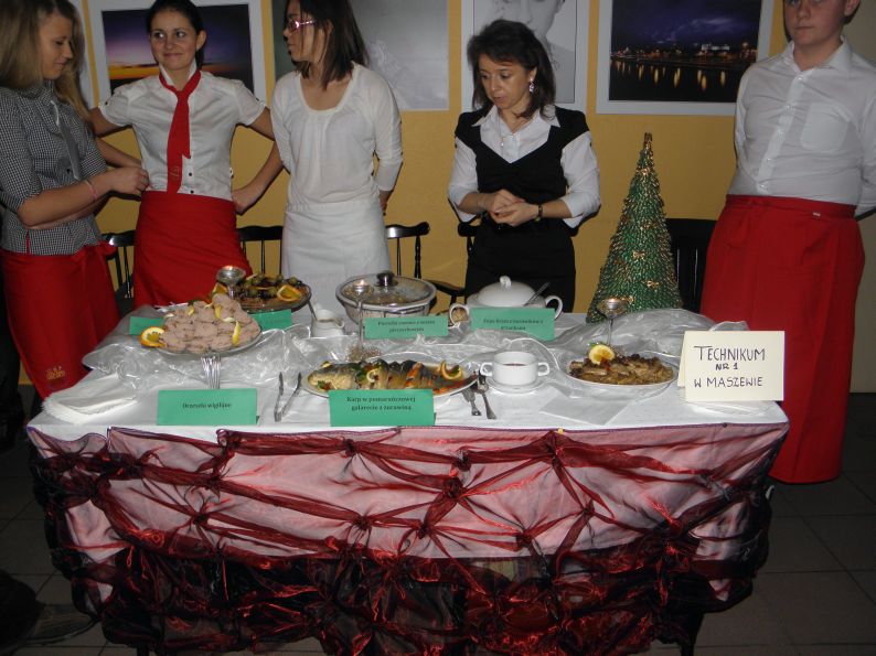 16 grudnia w Goleniowskim Domu Kultury odbył się konkurs "Polskie Potrawy Wigilijne", w którym wzięła udział młodzież z Technikum nr 1 w Maszewie pod kierunkiem p. Małgorzaty Węcławik -Adamczuk. Przygotowane potrawy oceniało jury, m.in. p. Wiesław Kartasiński z Hotelu Radisson i p. Anna Szatkowska z Hotelu Europa. Wigilijnych przysmaków próbowali też przedstawiciele władz Powiatu i Gminy oraz osoby z życia publicznego Goleniowa. Nasza szkoła otrzymała nagrodę główną GRAND PRIX za razowe pierożki z sosem pieczarkowym. Młodzież przygotowała również zupę borowikową z grzankami, karpia w pomarańczowej galaretce z żurawiną oraz orzeszki ziemne.