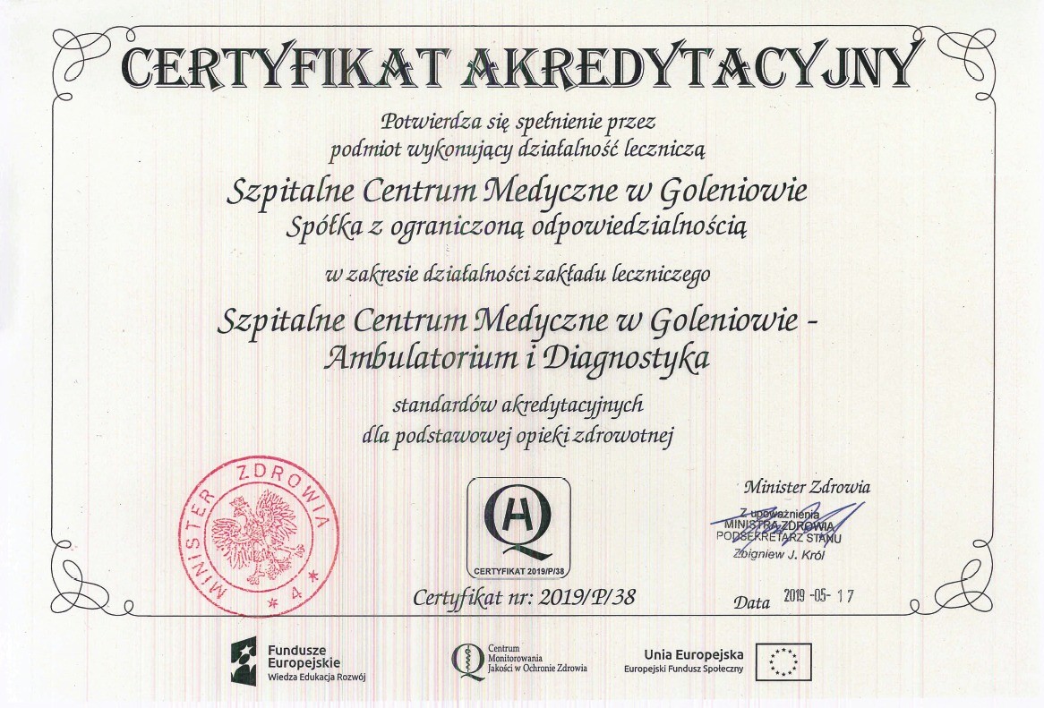 Szpitalne Centrum Medyczne w Goleniowie sp. z o.o. jest pierwszą jednostką w Powiecie Goleniowskim i trzecią w Województwie Zachodniopomorskim, któremu w dniu 17 maja 2019 roku przyznano Certyfikat Akredytacyjny Ministra Zdrowia dla Podstawowej Opieki Zdrowotnej.