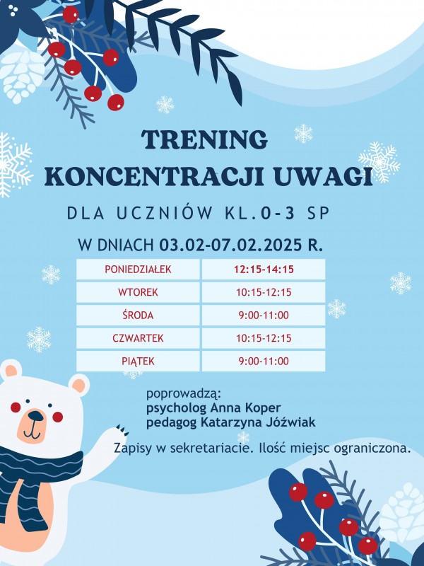 Poradnia Psychologiczno - Pedagogiczna w Goleniowie zaprasza na Trening Koncentracji Uwagi dla uczniów klas 0-3 SP w dniach 03.02.2025 r. - 07.02. 2025 r.